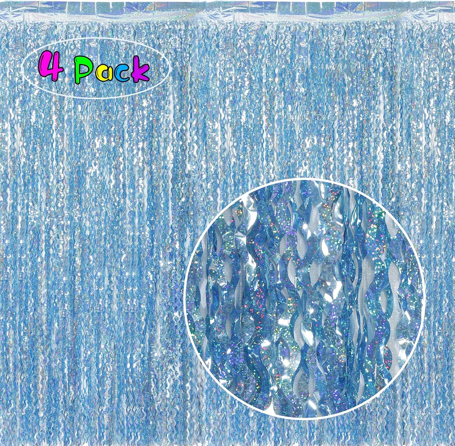 4 Pack Wavy Blue Tinsel Backdrop Streamers Party Decorations 3.3x6.6 Feet | Foil Fringe Curtain Ocean Themed | Blue Birthday Decorations