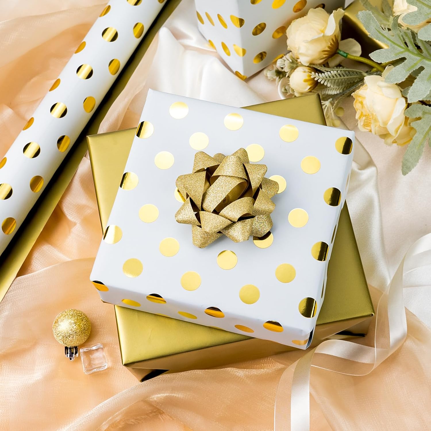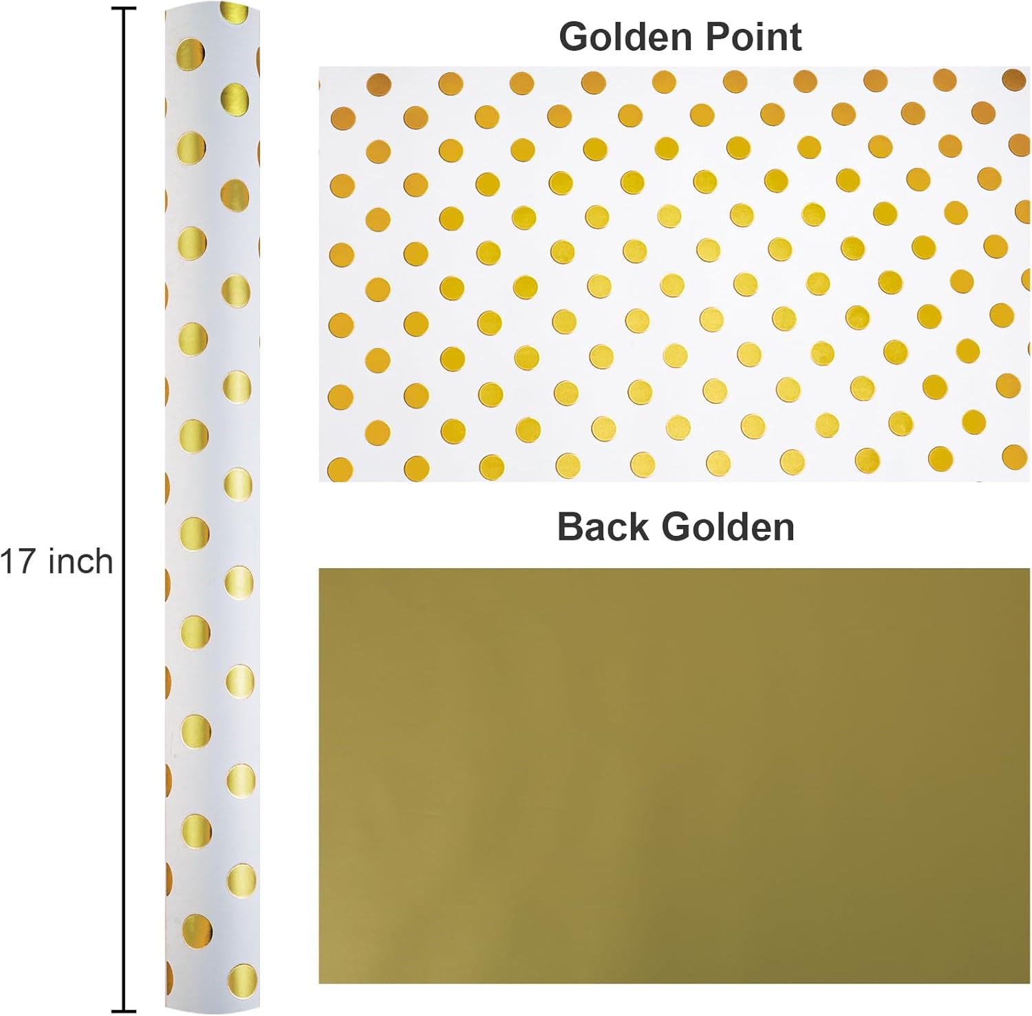- Double-Sided Wrapping Paper: One side features white and gold polka dots, while the other is solid gold, adding a touch of sophistication