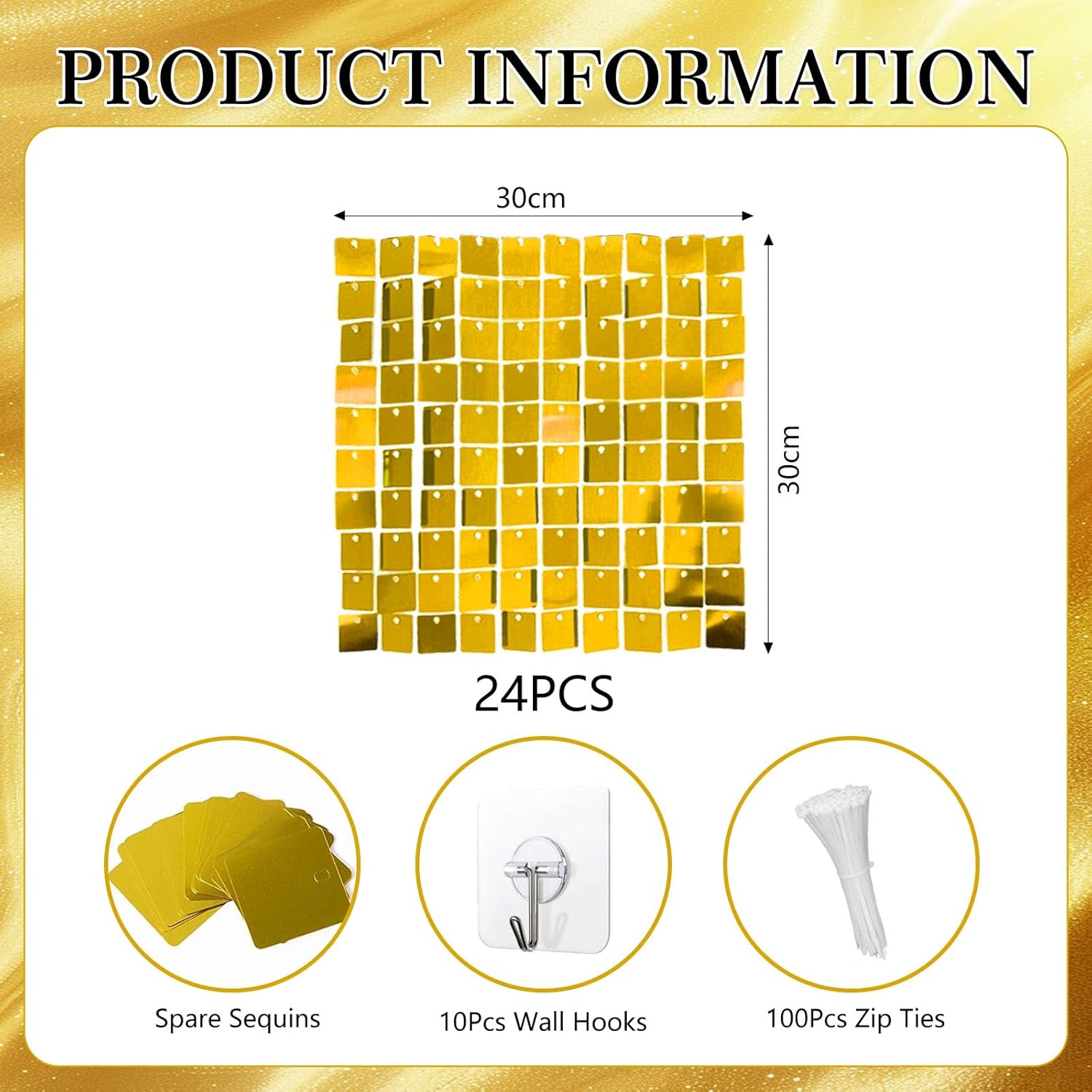 - Included Components : 24pcs Gold Shimmer Wall Panels, 10pcs Wall Hooks, 100pcs Zip Ties, Pack of Replacement Sequins, Installation Manual 24pcs Gold Shimmer Wall Panels, 10pcs Wall Hooks, 100pcs Zip Ties, Pack of Replacement Sequins, Installation Manual