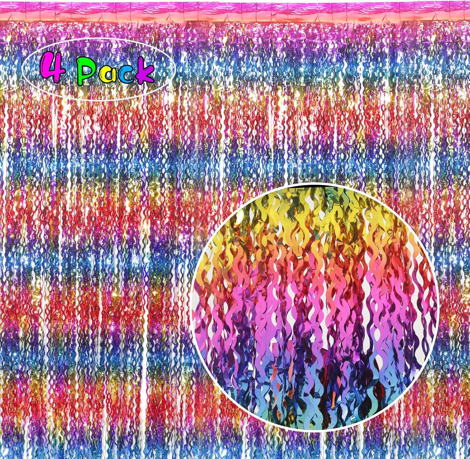 - Package Contents: 4 pack rainbow wavy foil fringe curtains,each curtain is 3.3ft x6.6ft,You can cut the colorful metallic backdrop into the suitable length for use,Wonderful accessories for decorating doors and walls