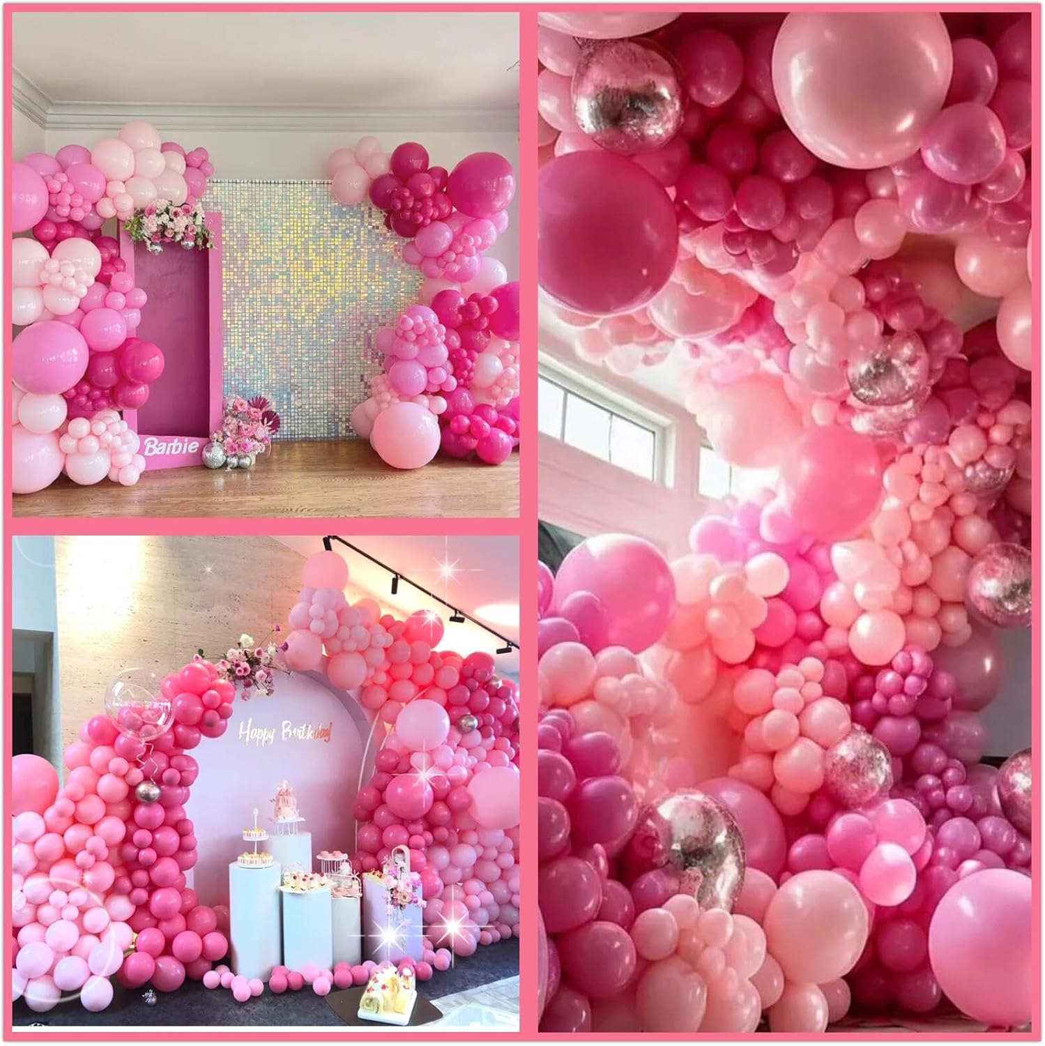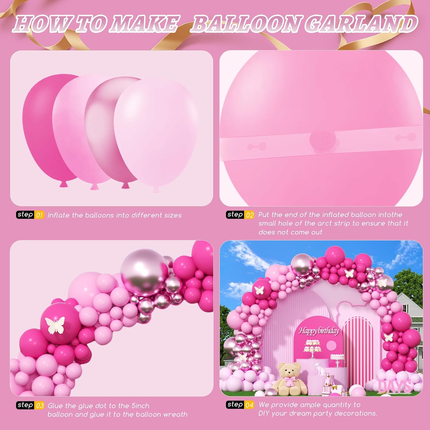 - Package List : Pink balloon arch Includes 412Pcs balloons, Hot Pink Balloons (4 x 18in, 30 x 12in, 30 x 10in, 60 x 5 in),Pink Balloons(4 x 18in, 30 x 12in, 30 x 10in, 60 x 5 in), Pastel Pink(4 x 18in, 30 x 12in, 30 x 10in, 60 x 5 in), Metallic Pink Balloons( 10 x 12in, 10 x 10in, 20 x 5 in) glue dotsx200, ribbonx2, decorative stripx2. plenty in quantity, Perfect for creating stunning indoor or outdoor balloon garlands and arche