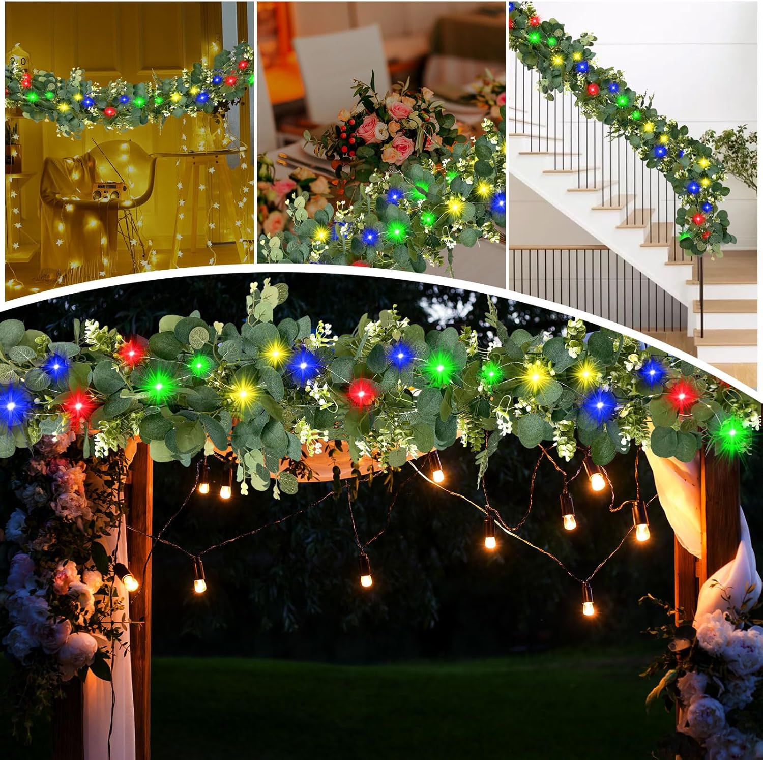 - 【Eucalyptus Garland with Lights】This package with 2 pieces of eucalyptus vines.Each artificial greenery garland is equipped with 20 LED Colored lights, providing a gentle glow to enhance your home's ambiance. These lights are powered by 2 AA batteries (not included)