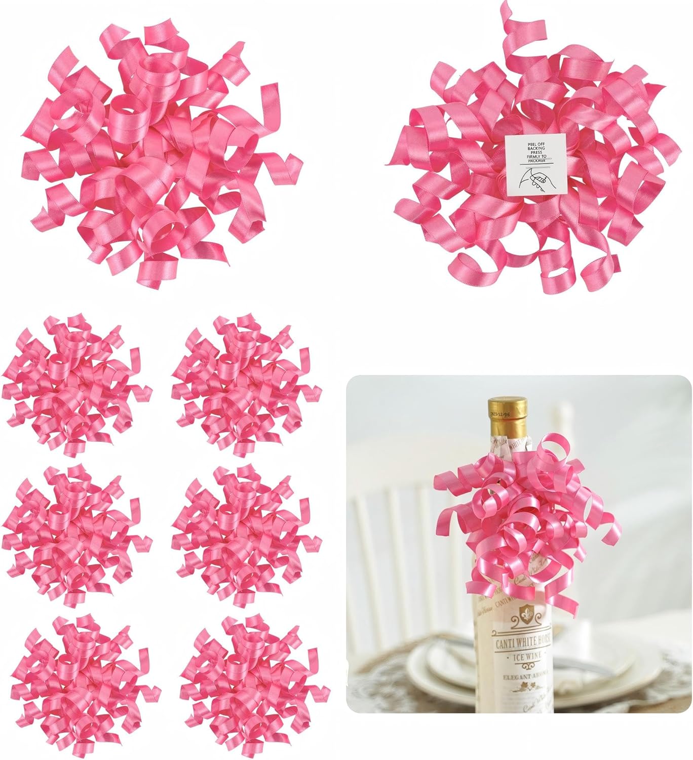 5'' Hot Pink Gift Bow Curly Ribbon Bows Set of 8, Double Faced Satin Ribbon Bow Premade Self Adhesive Bow Decorations for Party, Wedding, Holiday, Gift Bows for Crafts, Wine Bottle, Presents