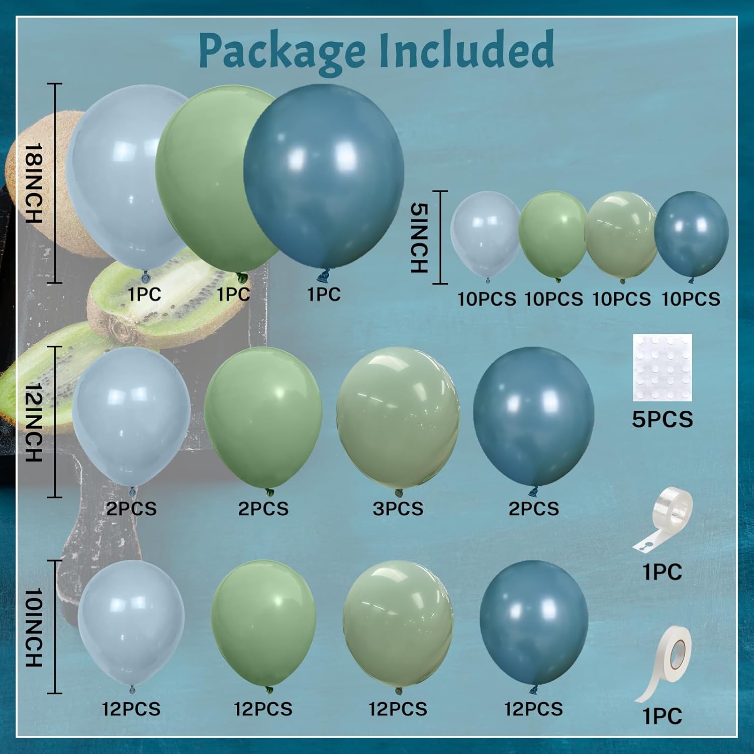 - What You Get - Dusty Blue Sage Green Balloon Garland Arch Kit, package including 3pcs 18 inches balloons(sage green*1, retro mist blue*1, navy blue*1), 9pcs 12 inches balloons(sage green*2, retro mist blue*2, dusty green*3, navy blue*2), 48pcs 10 inches balloons(sage green*12, retro mist blue*12, dusty green*12, navy blue*12), 40pcs 5 inches balloons(sage green*10, retro mist blue*10, dusty green*10, navy blue*10), 1 roll of 5-meter balloon strips, 1 roll of ribbon, 5pcs dot glues. Total 107pcs.