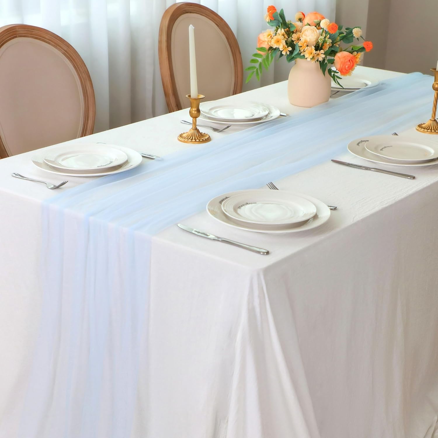 Snowkingdom Light Blue Cheesecloth Table Runner 10FT, Baby Blue Sheer Tulle Gauze Runner 120 Inch, Rustic Boho Party Table Decoration for Wedding Bridal Baby Shower Birthday Christmas Winter Holiday