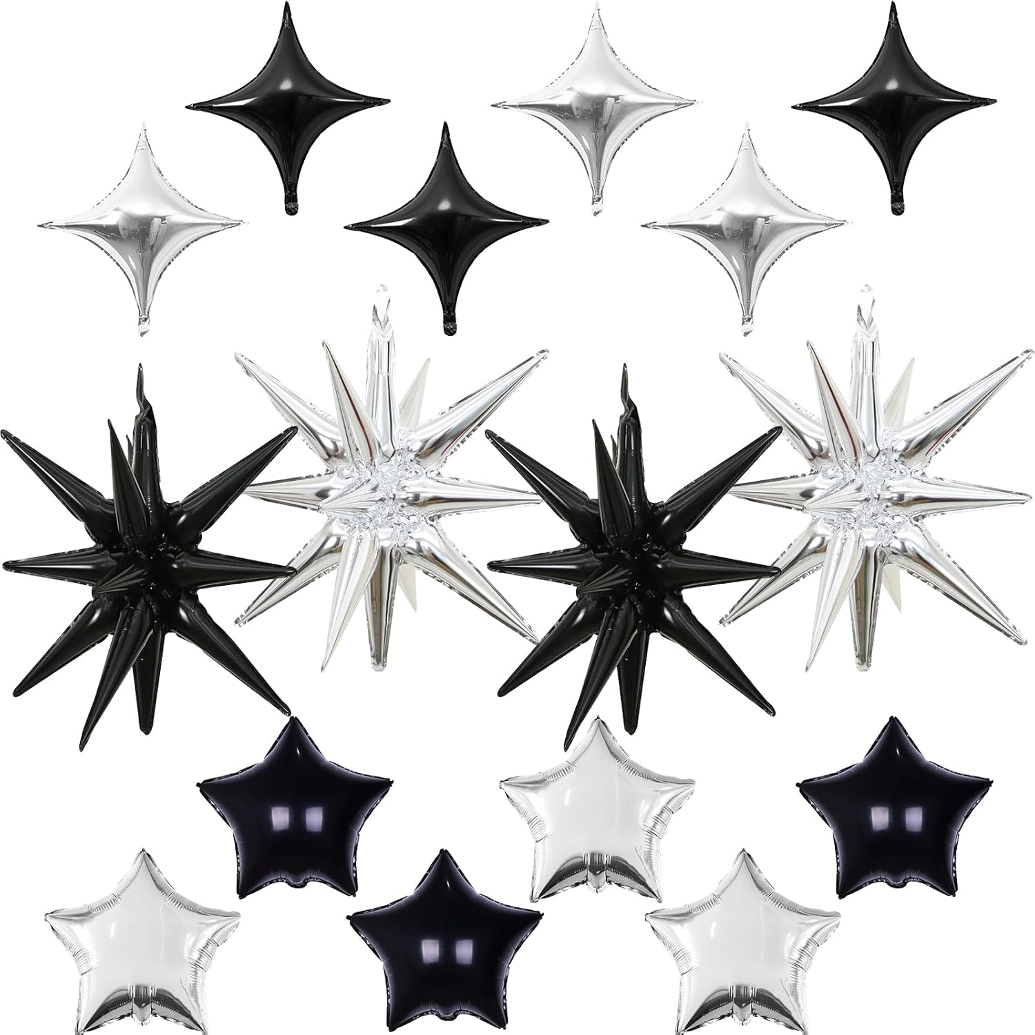 - Black Silver Balloons Set: Package includes: black, silver two-color aluminum foil star balloons (explosion stars ร 4, four-pointed stars ร 6, five-pointed stars ร 6) , a straw and ribbon