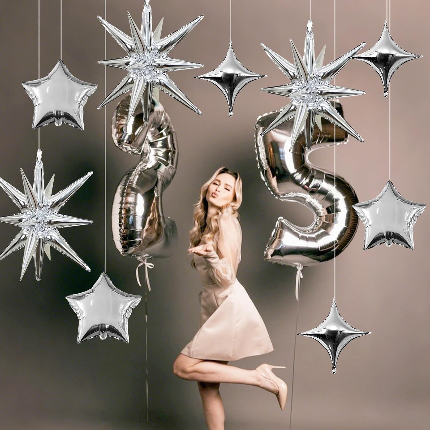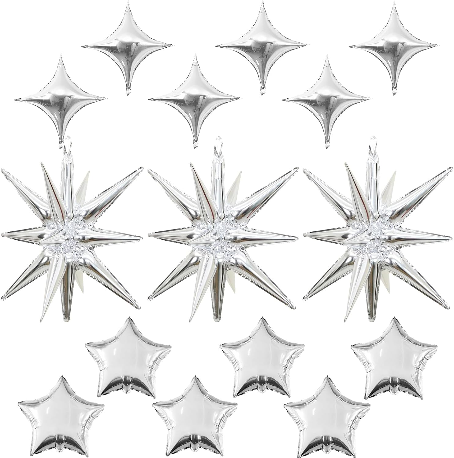 - Silver Star Balloons Set: Package includes: silver aluminum foil star balloons (explosion stars ร 3, four-pointed stars ร 6, five-pointed stars ร 6) , a straw and ribbon