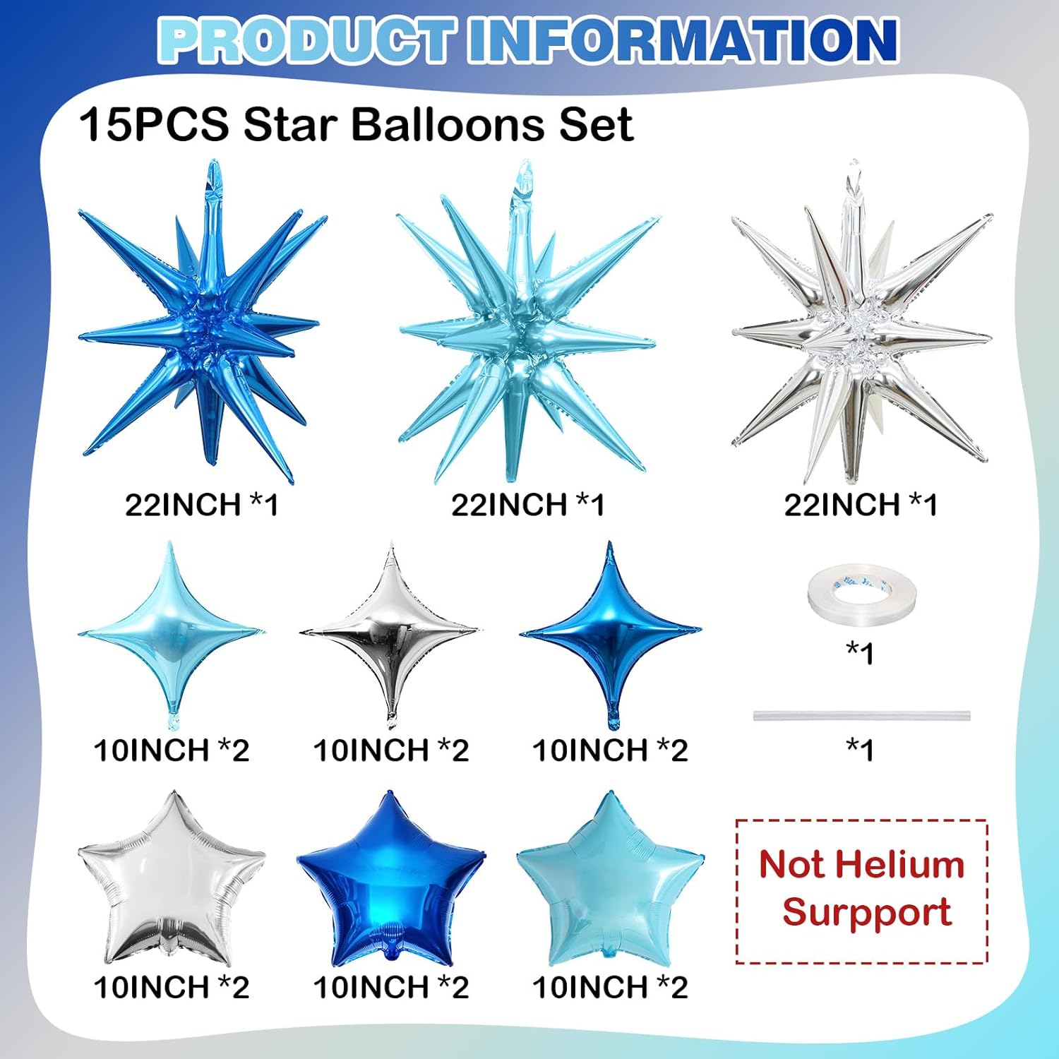 - Blue Silver Star Balloons: Package includes: dark blue, light blue, silver three-color aluminum foil star balloons (explosion stars ร 3, four-pointed stars ร 6, five-pointed stars ร 6) , a straw and ribbon