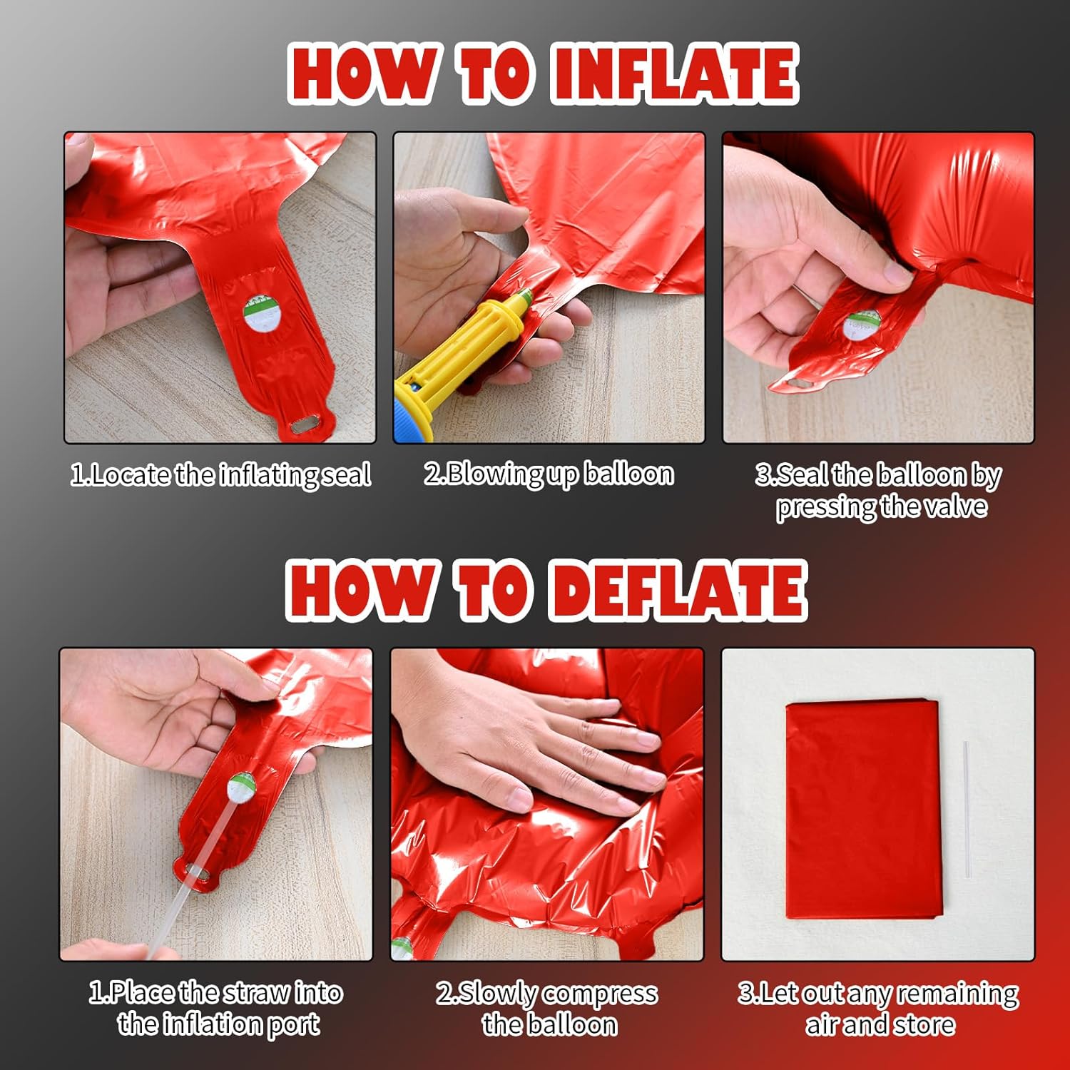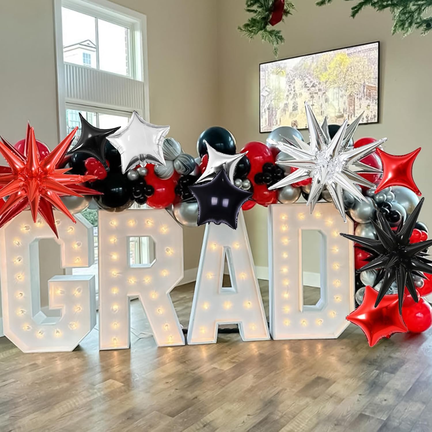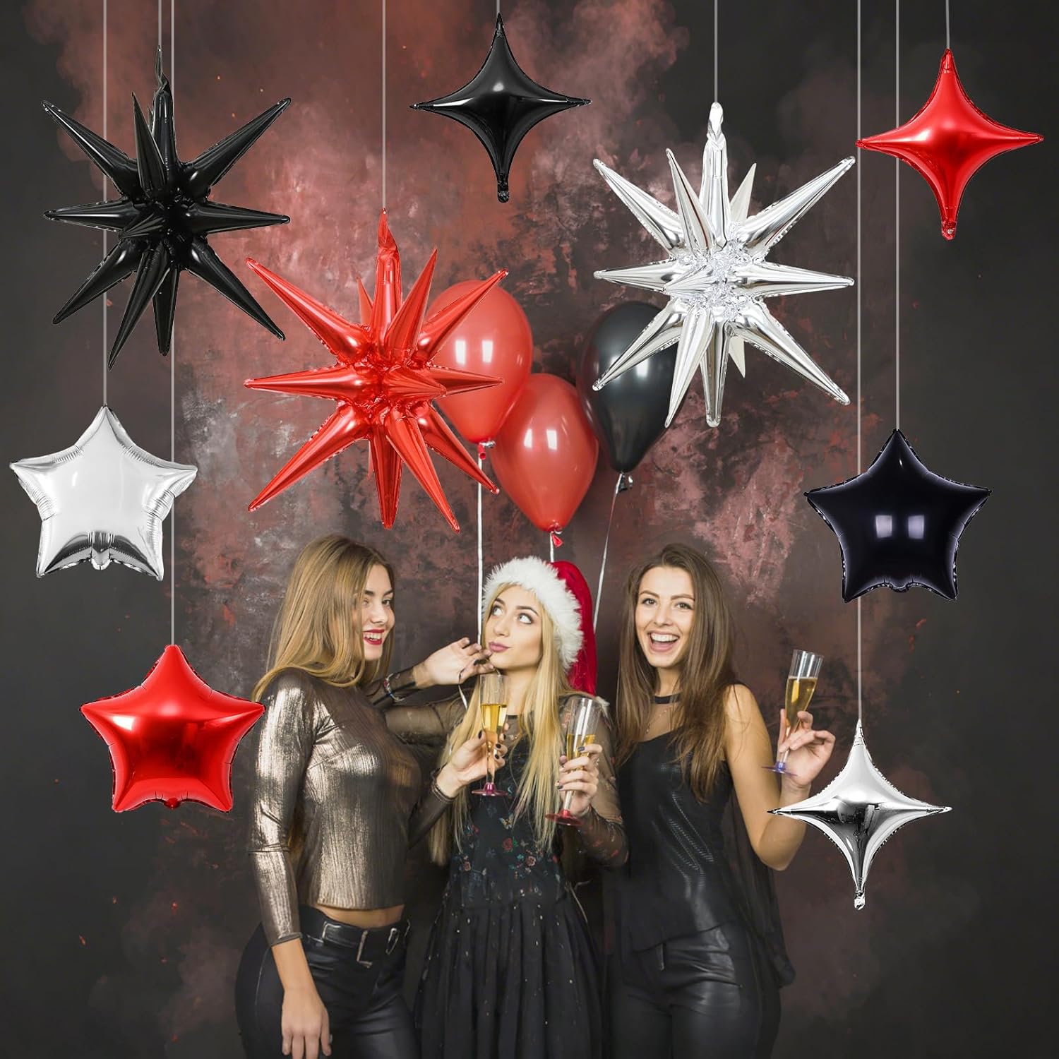 - Red Black Balloons Set: Package includes: red, black, silver three-color aluminum foil star balloons (explosion stars ร 3, four-pointed stars ร 6, five-pointed stars ร 6) , a straw and ribbon