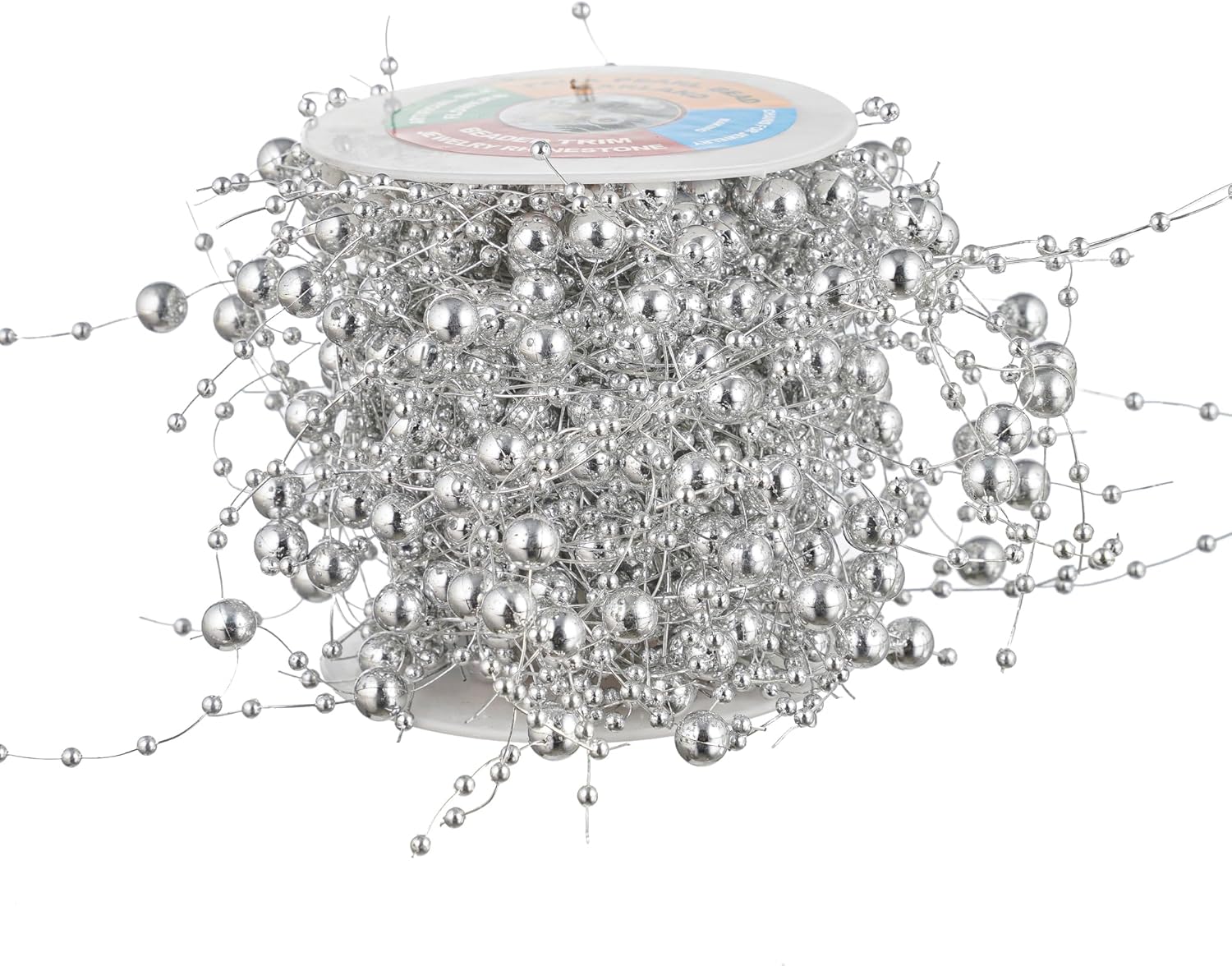 13Feet Pearl String Spool Roll for Floating Candles Faux Pearls Strands Garland for Vase Filler Wedding Centerpiece Christmas Table Decor (Silver)