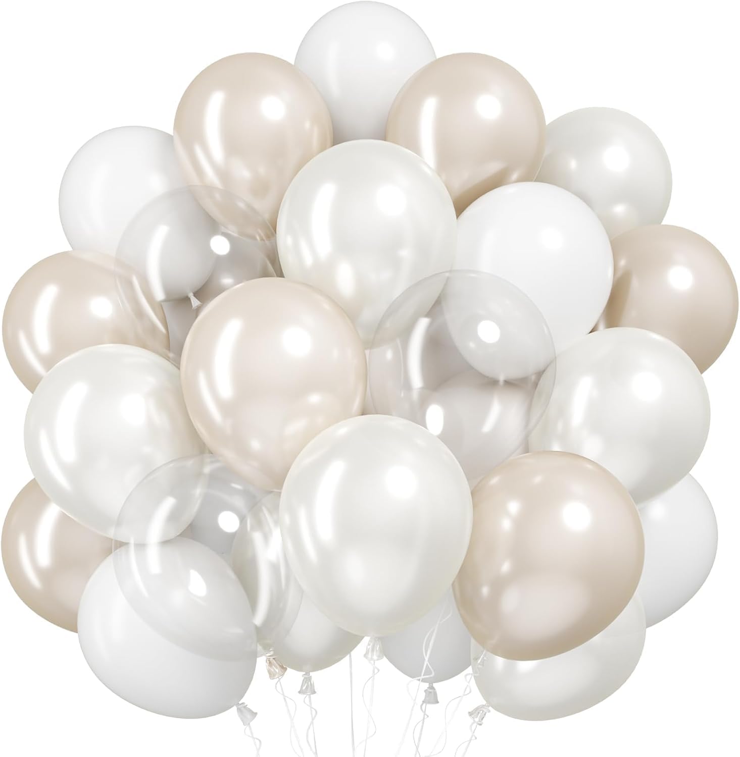 - 12 Inch Pearl White Balloon Set: 15 x pearl sand white balloons, 12 x matte clear balloons, 15 x white balloons, 8 x double balloons, and 1 x white ribbon. This stunning combination of soft white and cream balloon is ideal for creating an elegant atmosphere for weddings, baby showers, and other special celebrations.