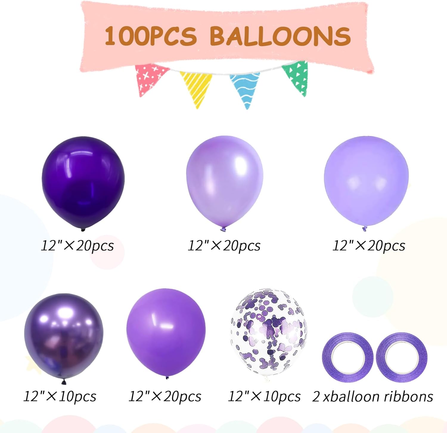 - Luxury Purple Party Balloons Kit : Includes 20 dark purple balloons, 20 light purple balloons, 20 Lavender Lilac balloons, 20 pearl purple balloons, 20 macaron purple balloons, 10 metallic purple balloons, 10 purple confetti balloons, 2 balloon ribbons. All the balloon size is 12 inches after inflation.