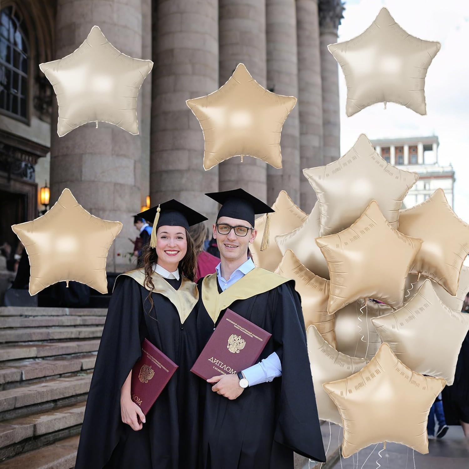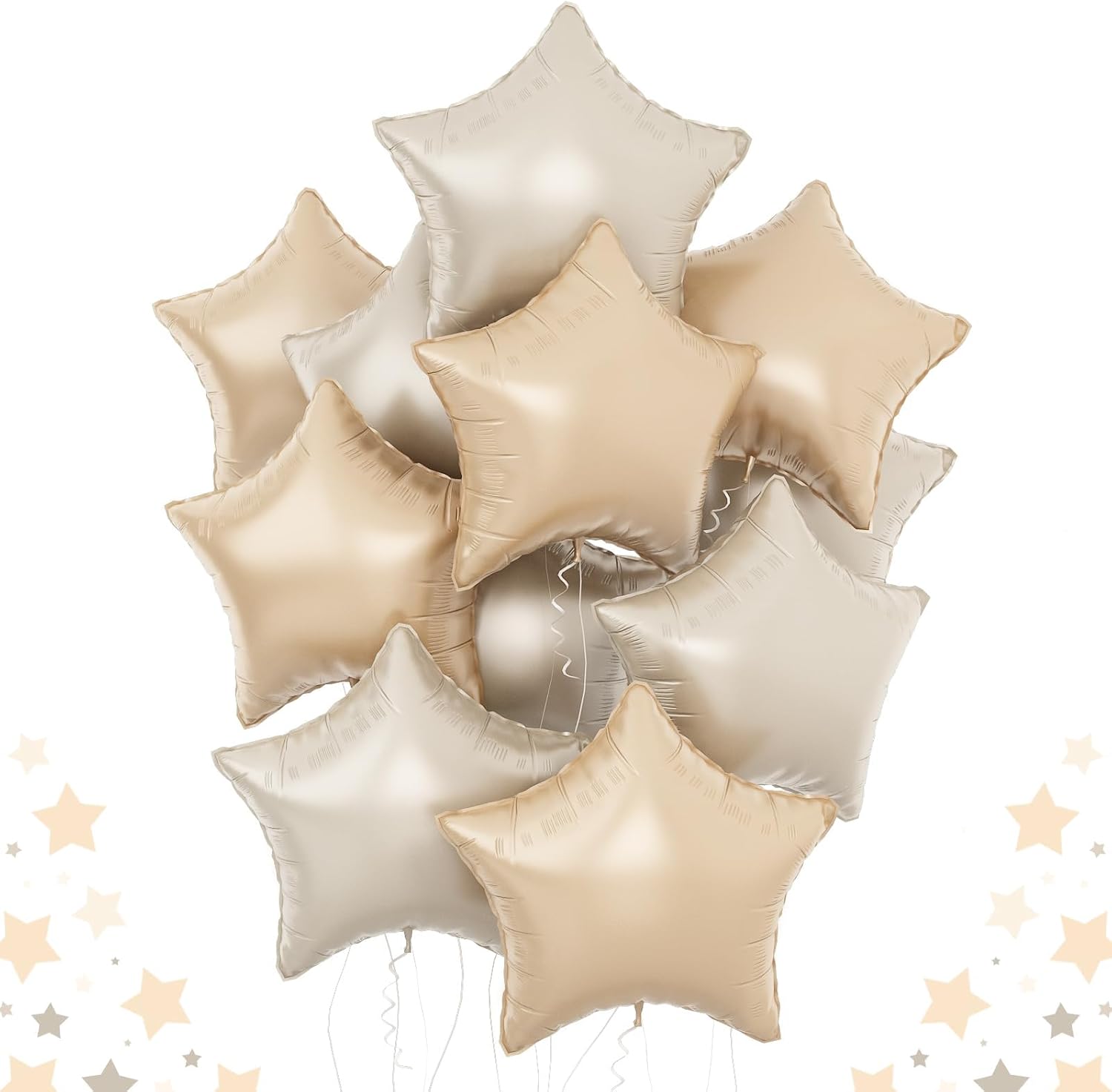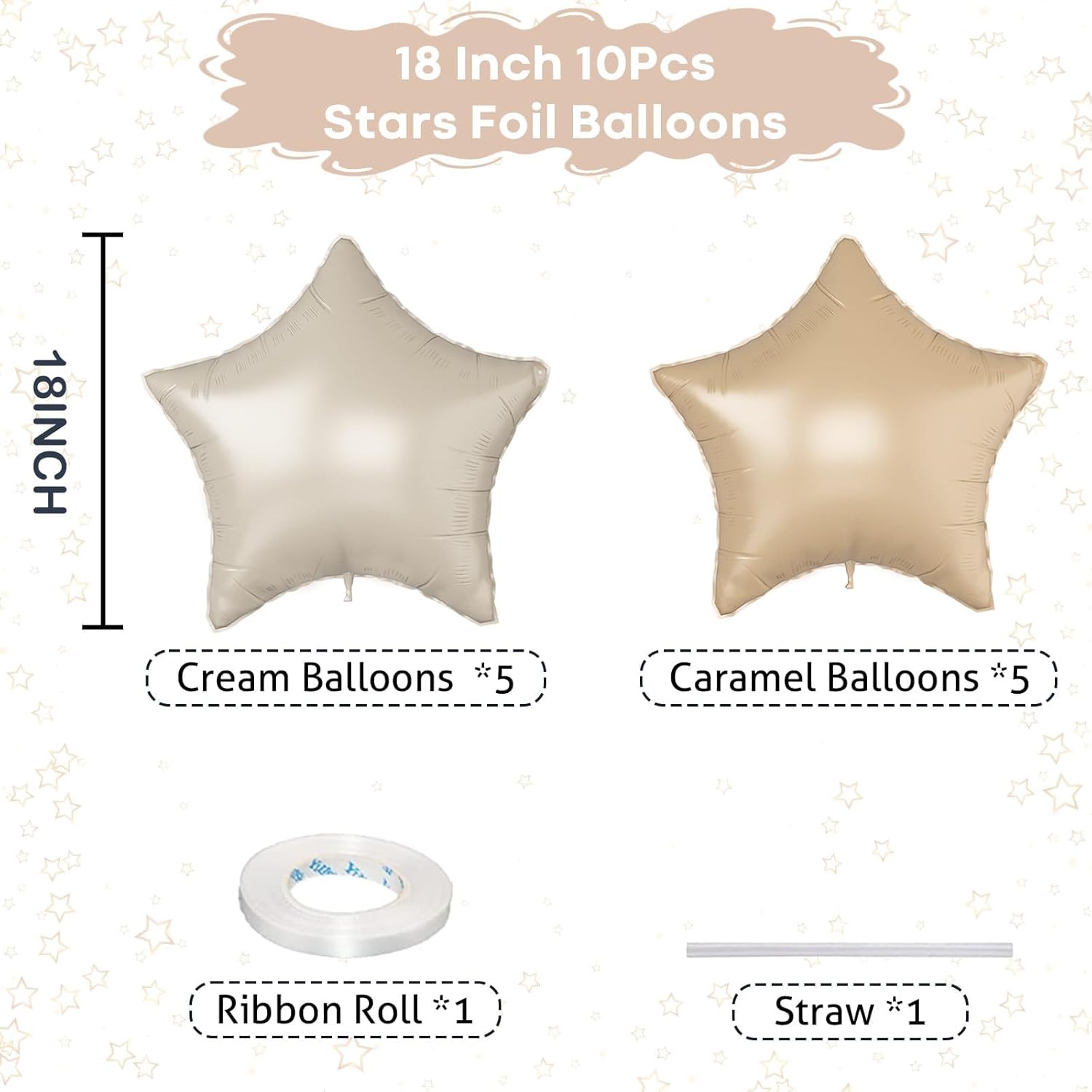 - Beige Apricot Stars Party Balloons: This 10Pcs nude caramel foil star balloons set designed with Giant 18 inch pentagram foil balloons, includes cream star mylar balloons and caramel star mylar balloons, each balloons set comes with a straw and ribbon