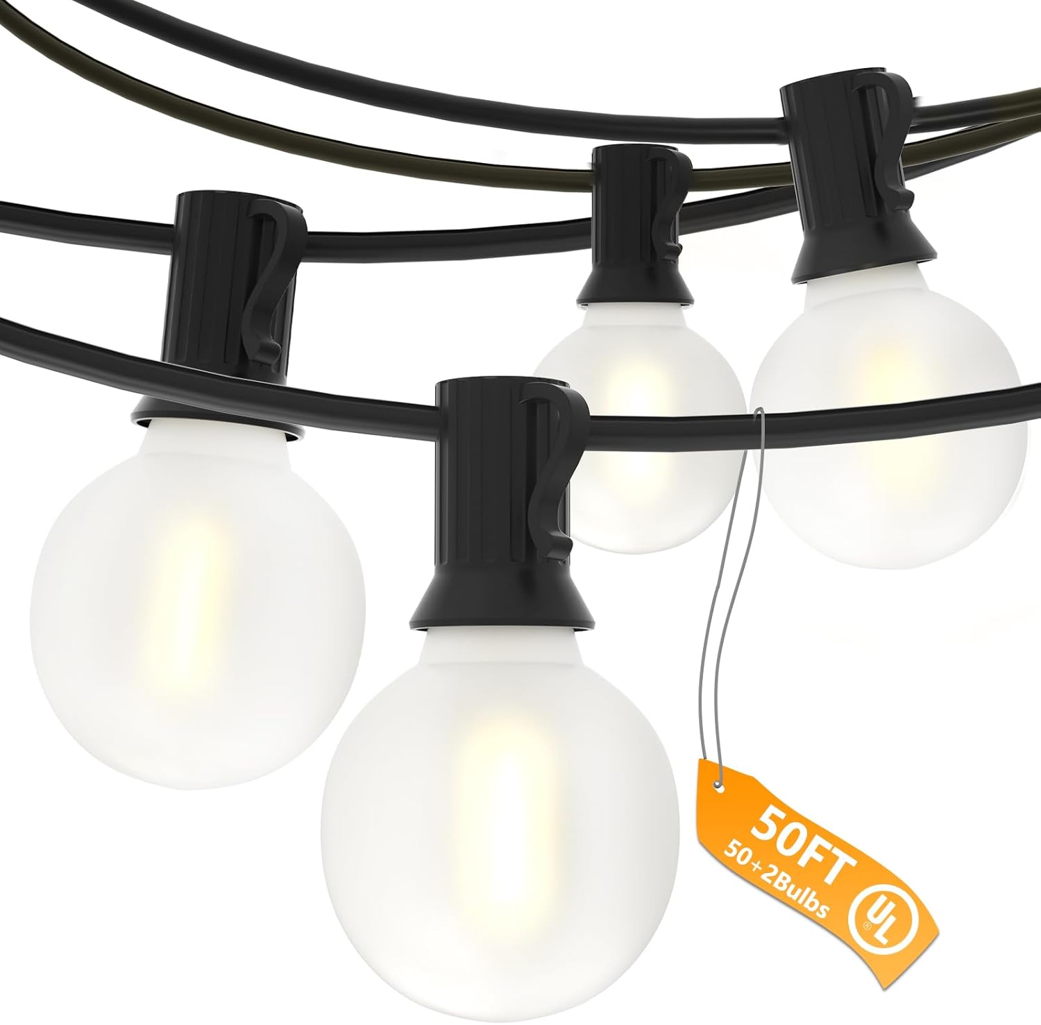 - Dimmable Compatible: 50FT outdoor string lights contain 50 G40 plastic frosted white LED bulbs and 2 spare bulbs. 1.5-inch bulbs adopt E12/C7 candelabra base, 0.6W per bulb, patio lights string can help you save more electricity bills (dimmer not included)