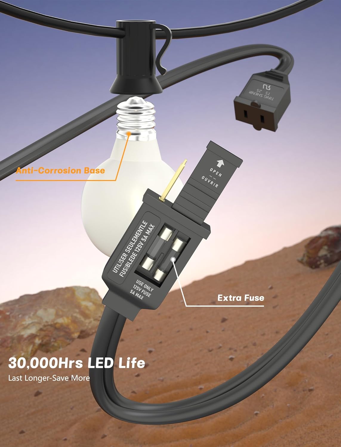 - Weatherproof and Safe: Waterproof outdoor string lights adopt weatherproof technology to withstand extreme temperatures, rain, wind and humid climates. Safe and durable patio string lights with built-in spare fuses for easy replacement