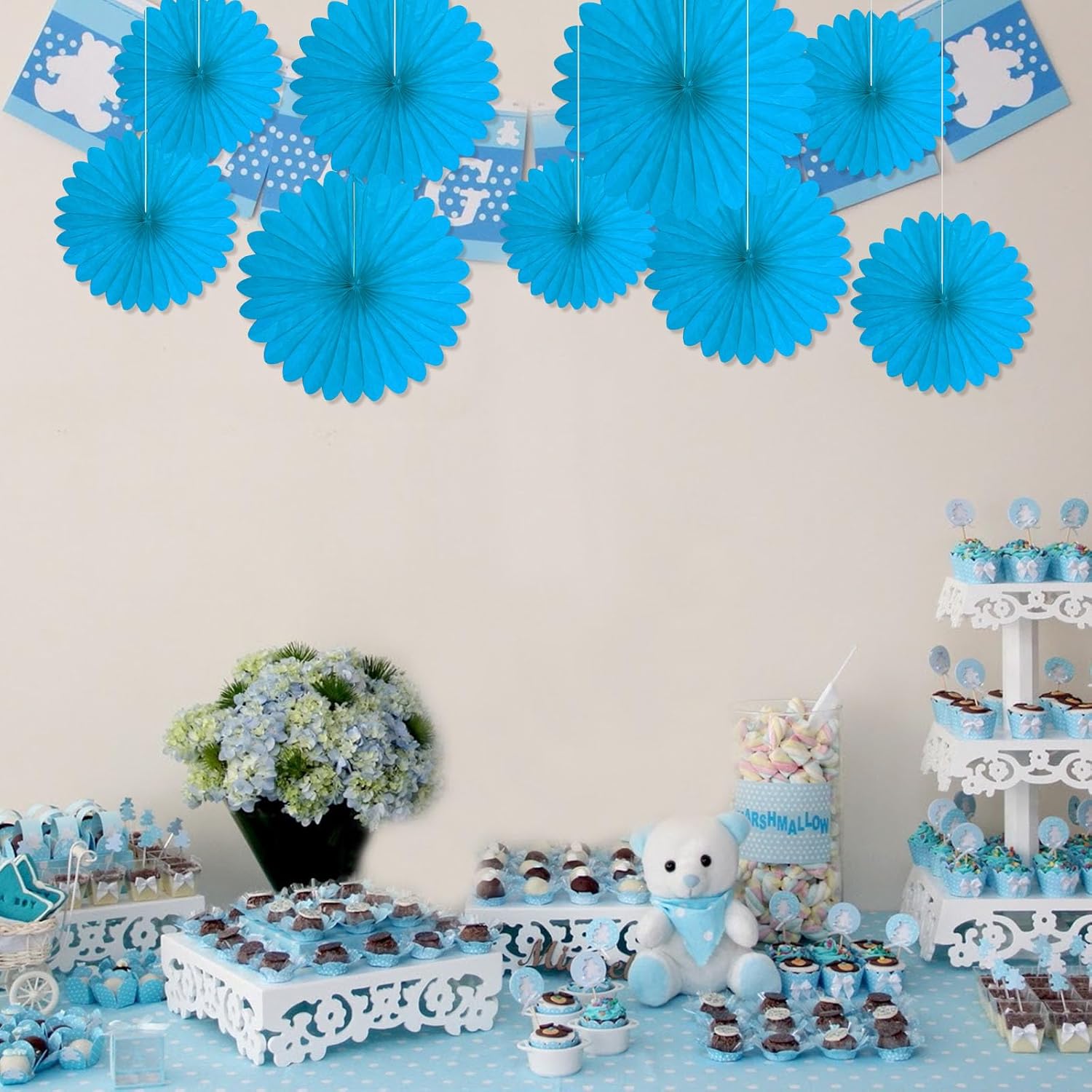 20 Pcs Sky Blue Hanging Paper Fan, Round Paper Fans Decorations Set for Weddings, Birthdays, Engagement, Bridal Shower, Baby Shower Event, Graduation, Party Supplies Decor