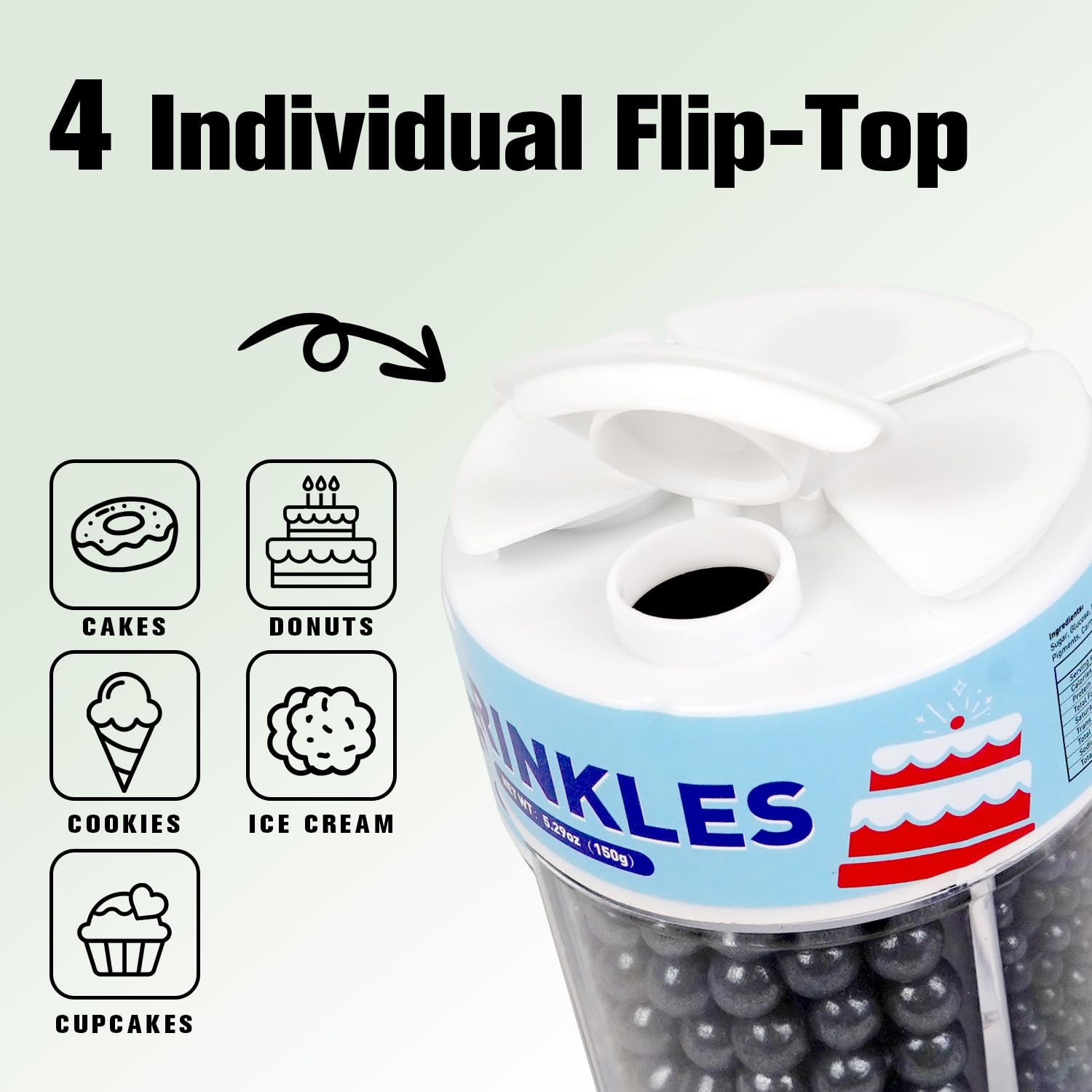 - Mix size Edible Black Sugar Sprinkles can meet the needs of decorative production of a variety of bakery products, with a high cost-effective. Pearl Sugar Sprinkles suitable for cakes, cookies, Ice cream, Cupcakes other Foods. 1 bottle of sugar sprinkles makes 3-5 cupcakes or one 3-inch diameter cake. After baking, you can place pearl sprinkles on top of the cake as decoration.