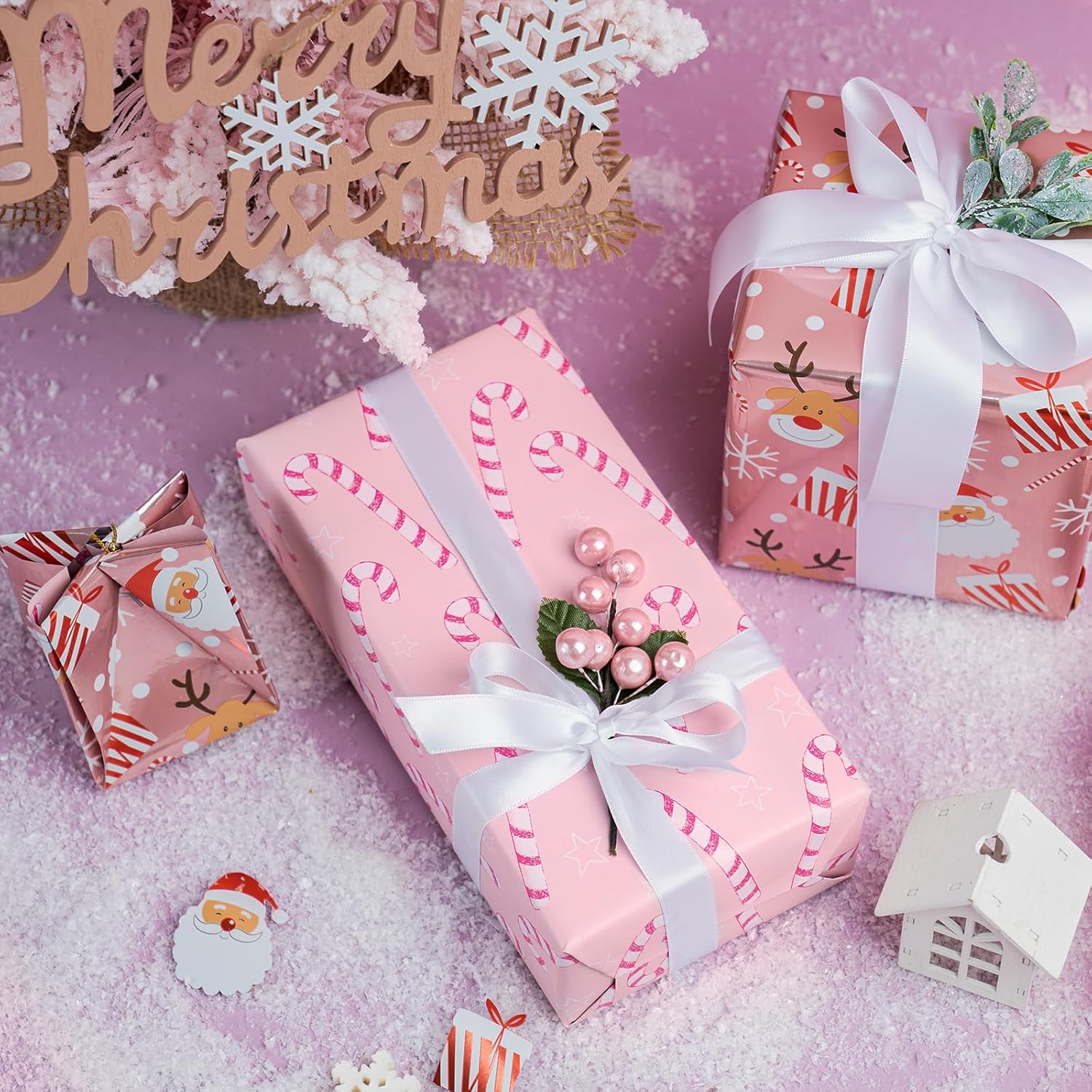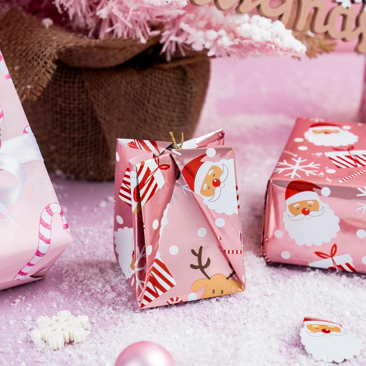 LeZakaa Christmas Pink Wrapping Paper Jumbo Roll, Santa Claus & Candy Cane, Metallic Foil, Rose Gold Foil Reversible Design for Festive Winter Holiday, Family Gathering, 30 inches x 100 Feet