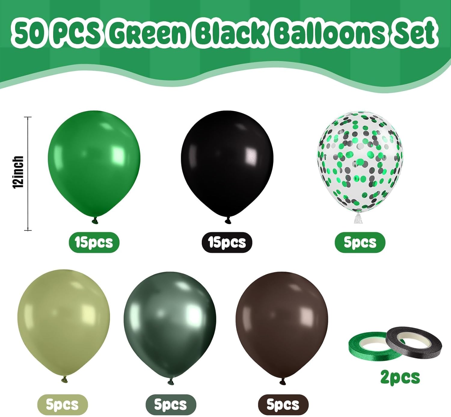 - 【WHAT YOU WILL GET】Our Camo Camping Theme Birthday Party Balloons include 50pcs latex balloons, designed to help you create stunning decoration: 15 x dark green balloons, 15 x black balloons, 15 x brown balloons, 5 x metallic avocado green balloons, 5 x retro avocado green balloons, 5 x confetti black green balloons, 1 x green ribbon and 1 x black ribbon. The size of the balloon is about 12 inches after inflation.coration.