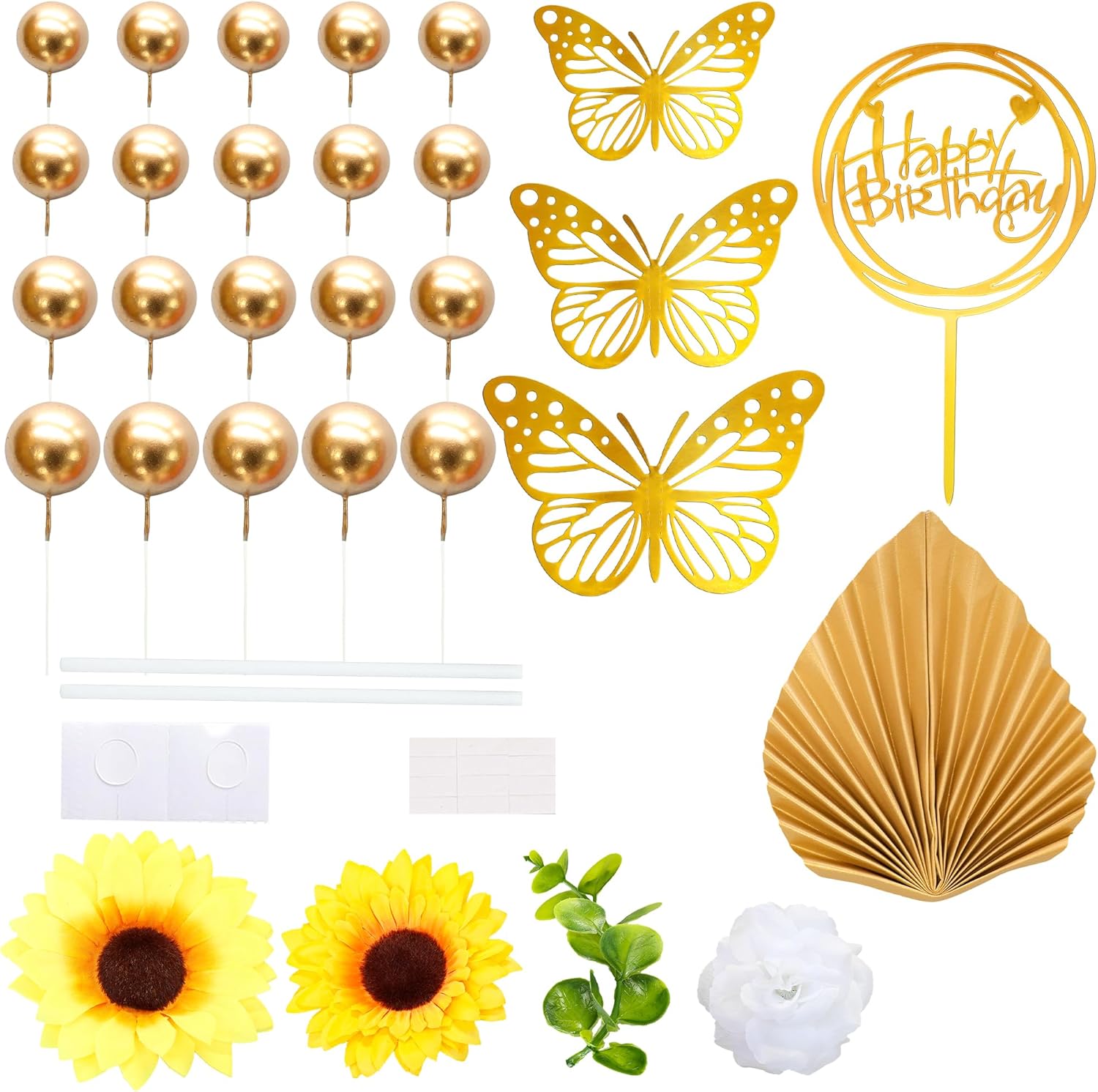 - -Package included: 12Pcs Butterflies + 6Pcs Artificial Flower + 1Pcs Happy Birthday Cake Topper + 2Pcs Palm Fans + 5Pcs Leaves Cake Toppers + 28Pcs Balls. These Artificial Sunflower Cake Toppers are so chic and funny that make your Bridal Shower theme party a big hit.