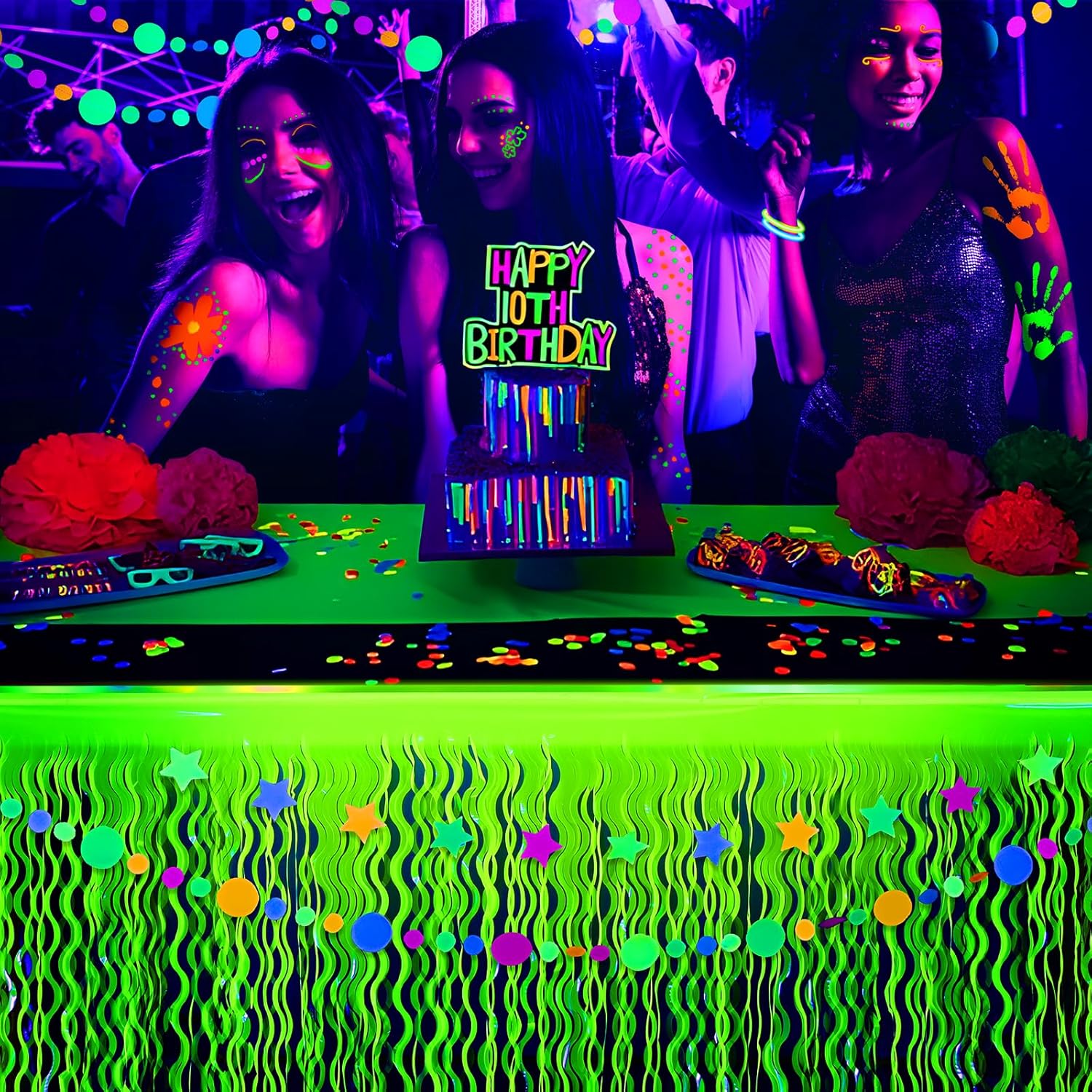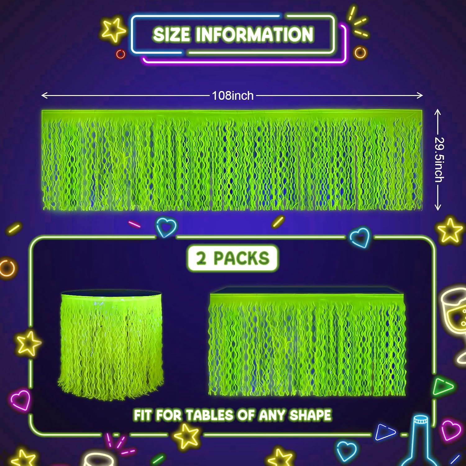 - 【 NEON PARTY DECORATIONS 】: Our unique neon fluorescent tinsel foil fringe table skirts are the perfect photo decorations for neon birthday party dessert table decorations. You will be immersed in the rich colors and glow in the dark party atmosphere they create.