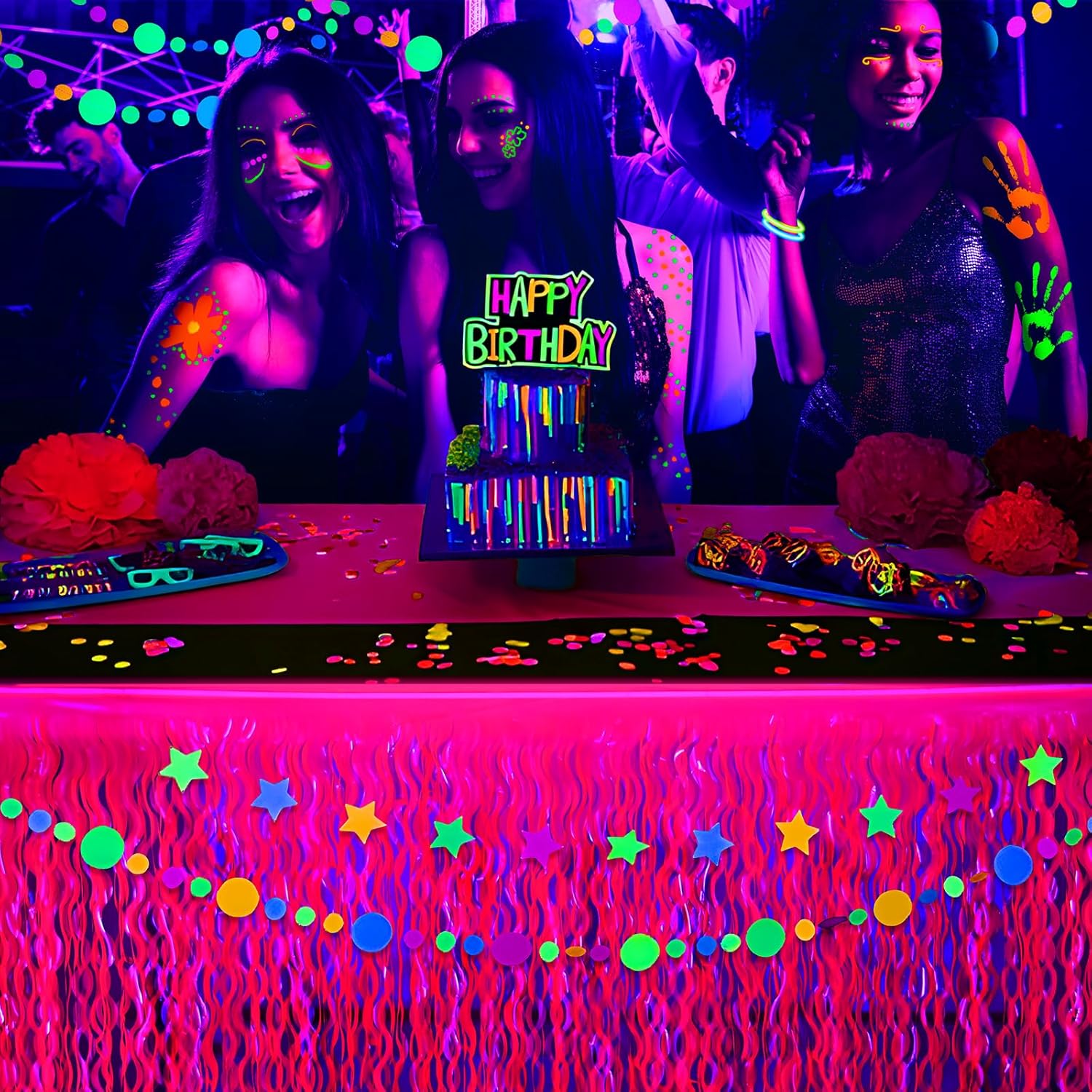- 【 WIDELY APPLICATIONS】: Our glow in the dark neon foil fringe table skirts are perfect for neon birthday party, dessert table decoration, suitable for both rectangular and round tables. You won't regret choosing this table skirts to make your table the center of the party.