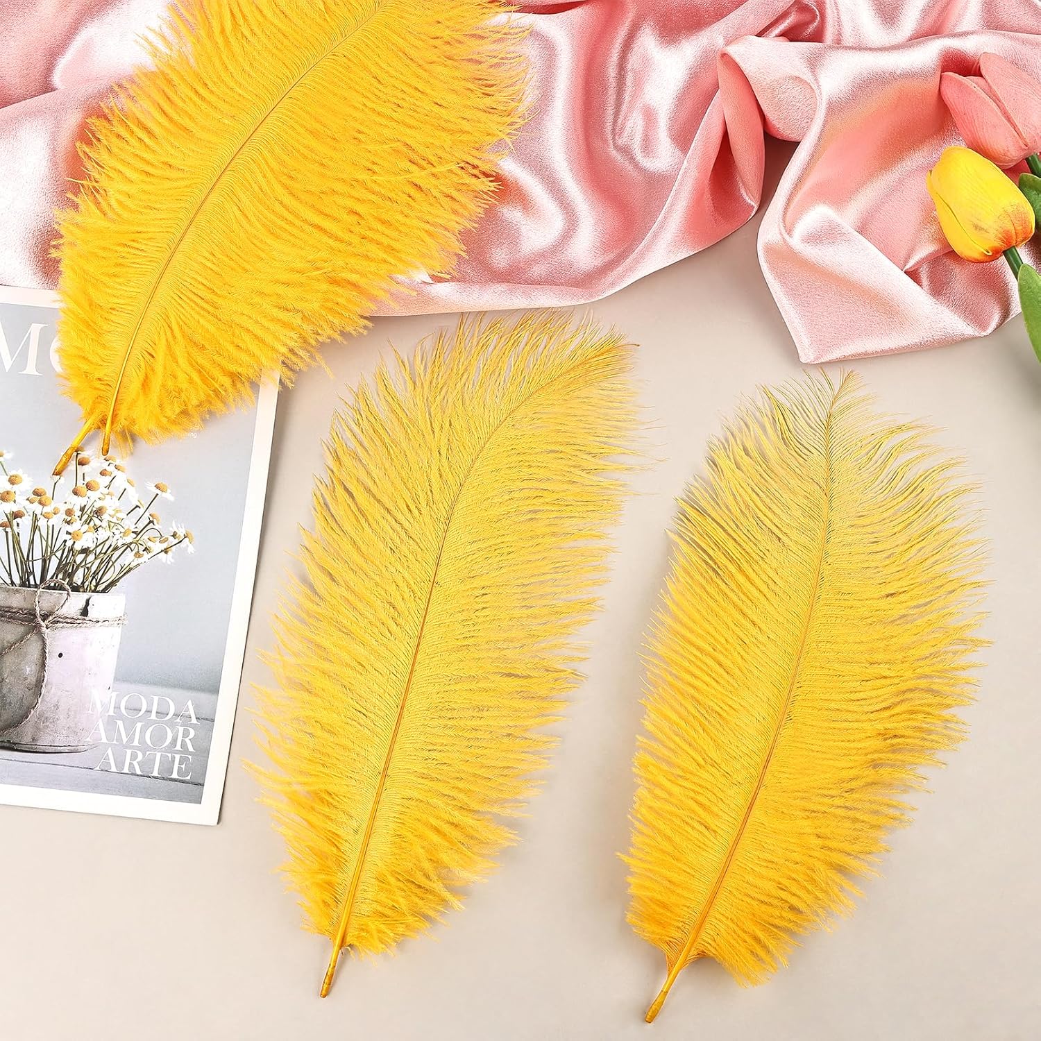 THARAHT Golden Yellow Ostrich Feathers 24pcs Natural Bulk 8-10Inch 20cm-25cm for Crafts Wedding Party Centerpieces Halloween and Home Decoration Feathers