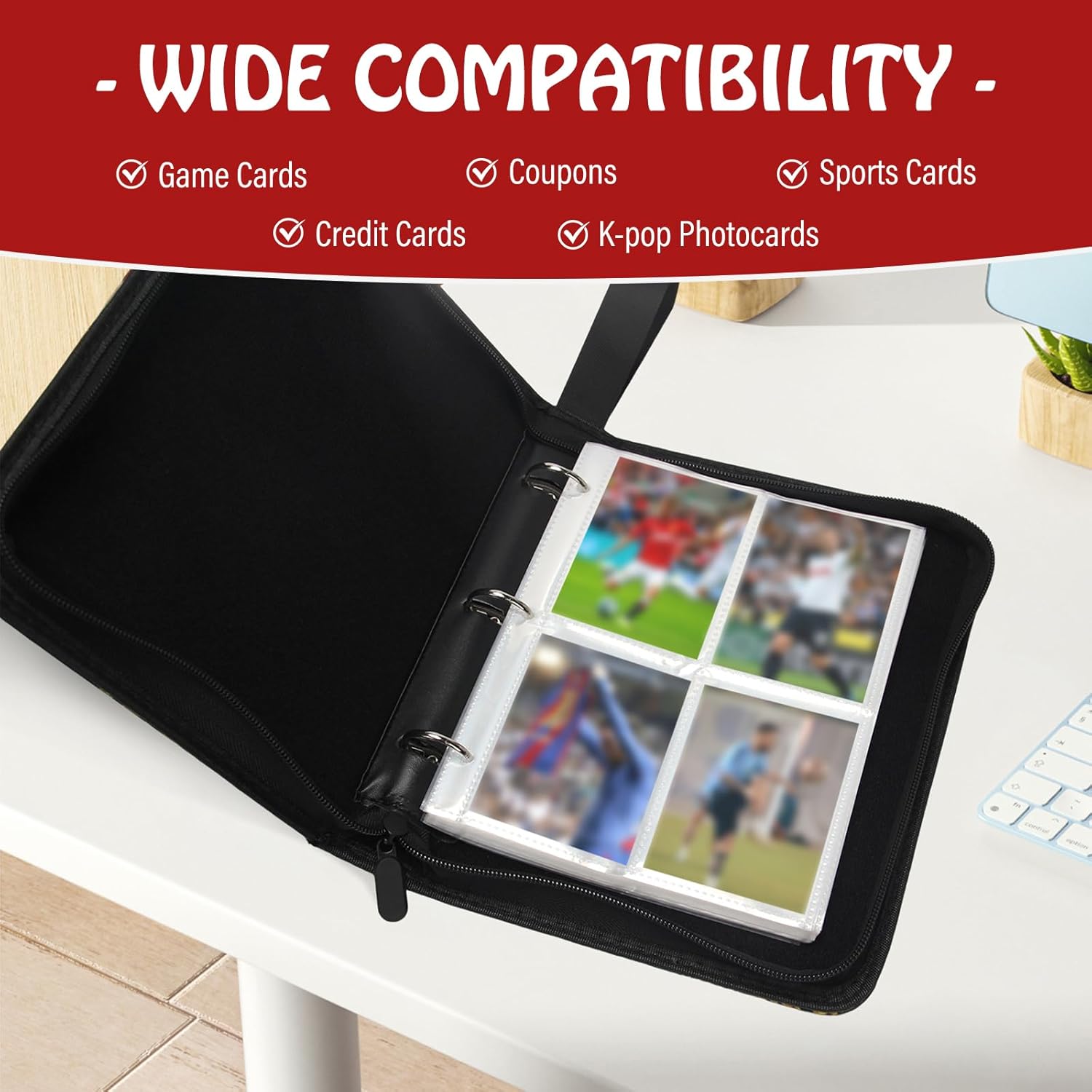 - Unique Design:Open the creative card holder along the zipper direction, select the card you want to collect, and gently insert it into the card slot. The flexible 3-ring design allows you easily to insert and remove the pages,the clear and transparent card slot allows you to see every detail of the cards without taking out