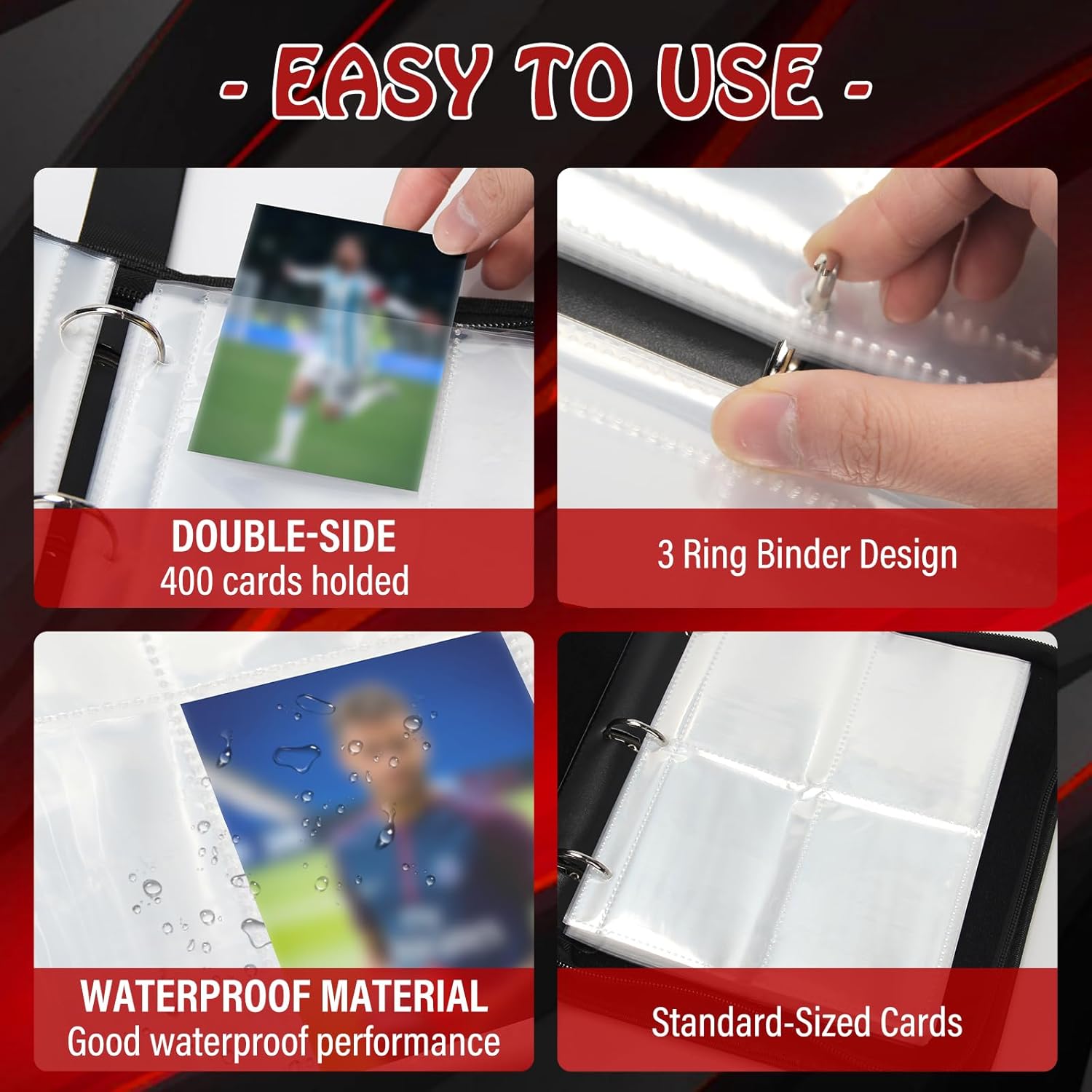 - Large Capacity Size: Inside page size: 2.68*3.5in,The card binder comes with 50 removable sleeves, which can hold up to 400 trading cards with 4 pockets on each side, allowing you to store cards on both the front and back.The trading card binder case is compatible with svarious standard-sized cards, Game Card , Football cards, Baseball cards