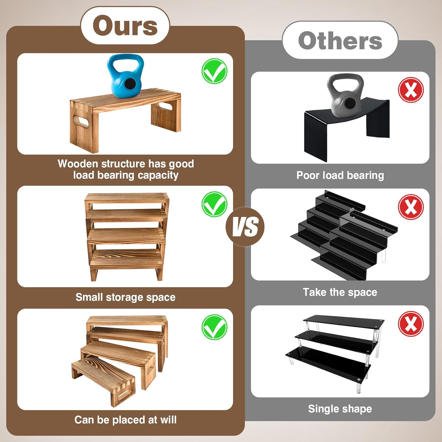 - High-Quality Materials: This set of wooden display risers is made of high-quality natural solid wood, which is durable and well-made. The natural wood texture with carbonized color makes the collection in the display stand out and suitable for any decorative furniture in the home