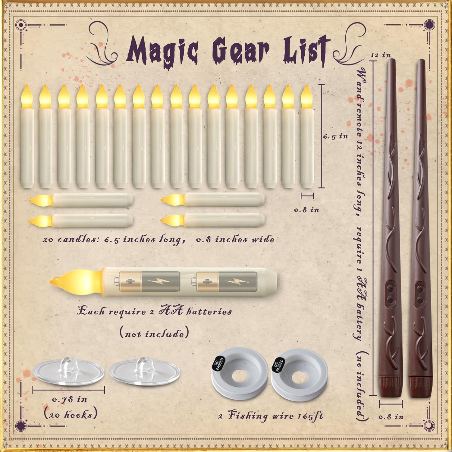 - Dimensions: 0.79 inches (2cm) D x 6.5 inches (16.5cm) H, The battery operated taper candles with a remote will bring a feel of the magical world, lifelike candlelight provides warm and bright yellow light for visibility and ambiance. They are amazing magical kits to fulfill your dreams of becoming a sorcerer's apprentice.