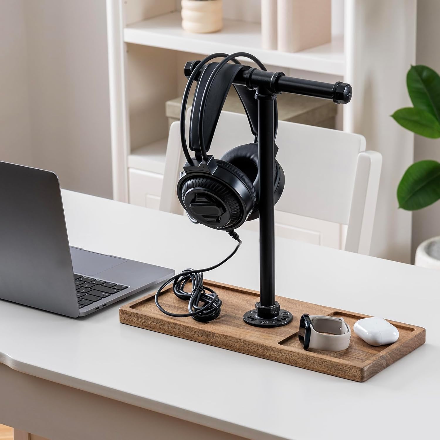 FARM IN Solid Acacia Wood Headphone Stand for Desk Industrial Headset Holder with Storage Base for Gaming and Office Accessories