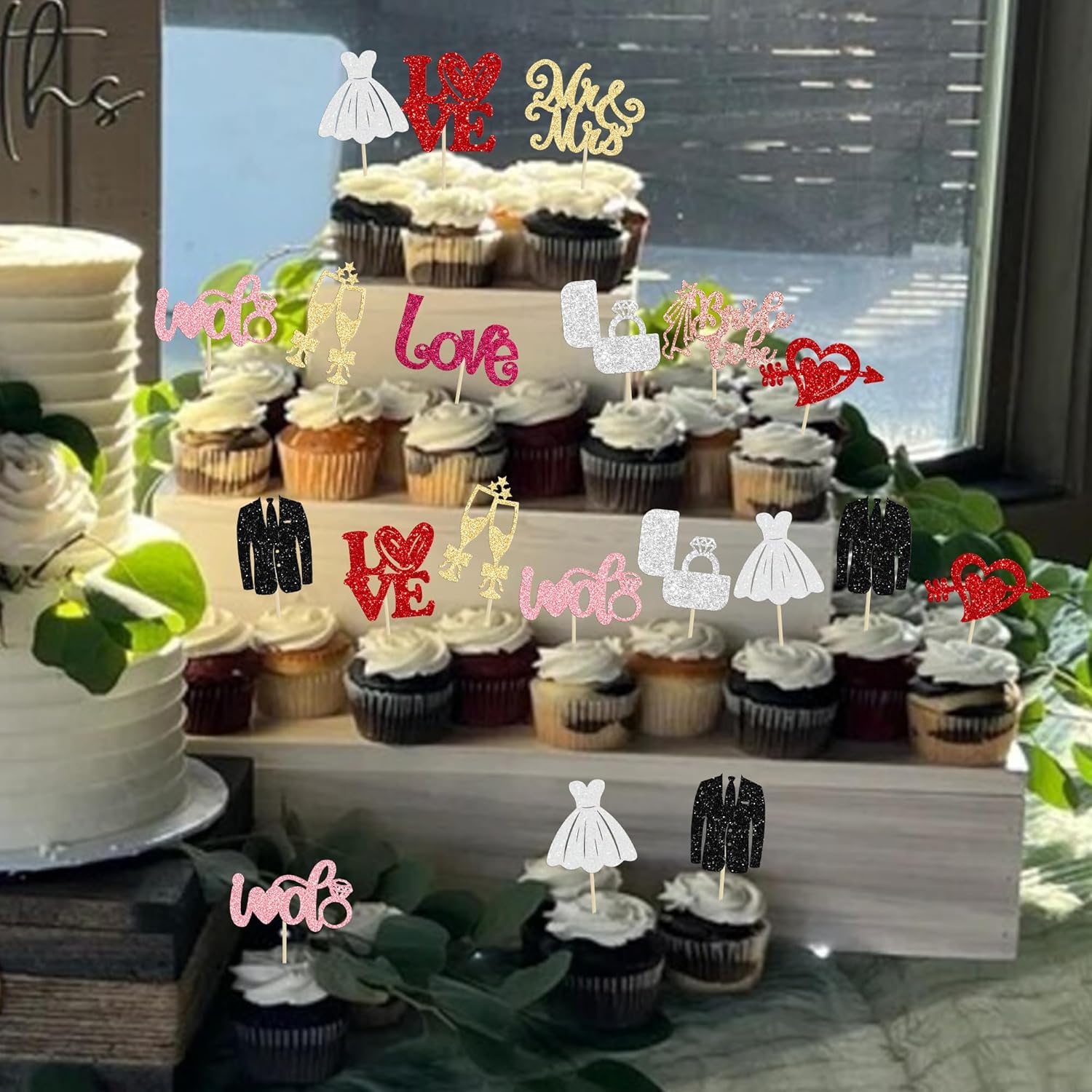 Ephlyn 30Pcs Bride to be Cupcake Toppers Glitter Wedding Cake Topper Decorations I Do Love Heart Ring Cupcake Picks for Bridal Shower Wedding Engagement Party Supplies Multicolor