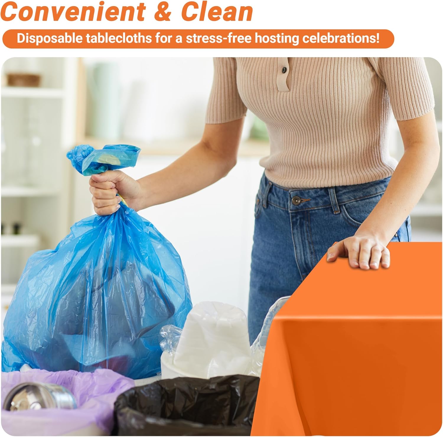 - Quick and Easy Cleanup: These orange plastic tablecloths effortlessly handle spills from meals, beverages or art supplies. Simply dispose of them after use for hassle-free cleanup!