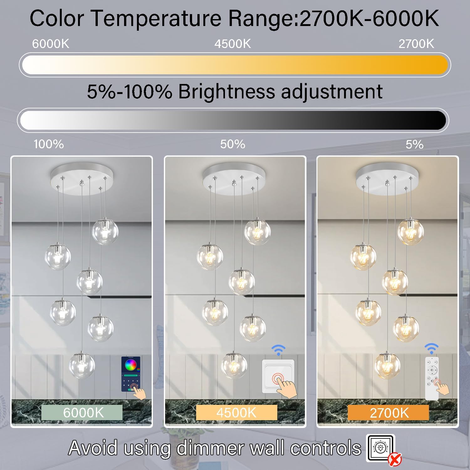 - 【Smart LED Chandelier 】It is equipped with a remote control and APP control for seamless dimming between warm white (2700K) and cold white (6000K), as well as adjustable brightness ranging from 5 to 100 percent.