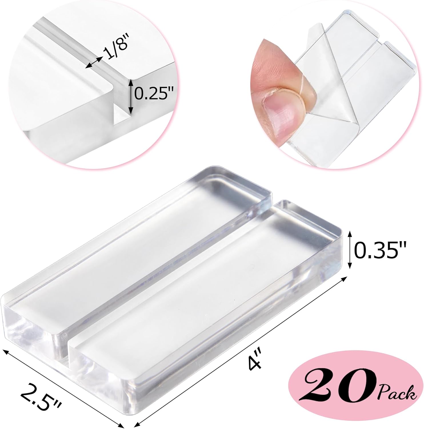 - Portable Acrylic Place Card Holder Value Set: The 20-pack of 4" clear acrylic place card holders (4"L×2.5"W×0.35"H) features 1/8"W×0.25"H slots. Ample table card holders meet your daily use and replacement needs. Note: Card shown in images not included
