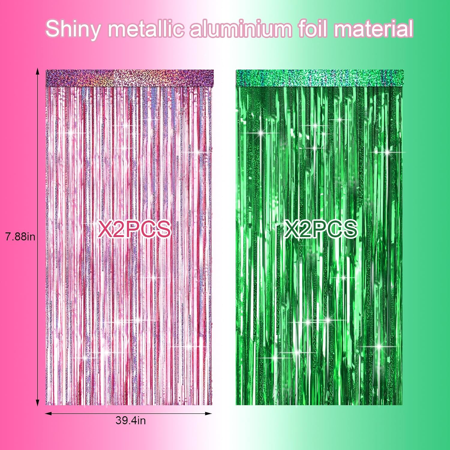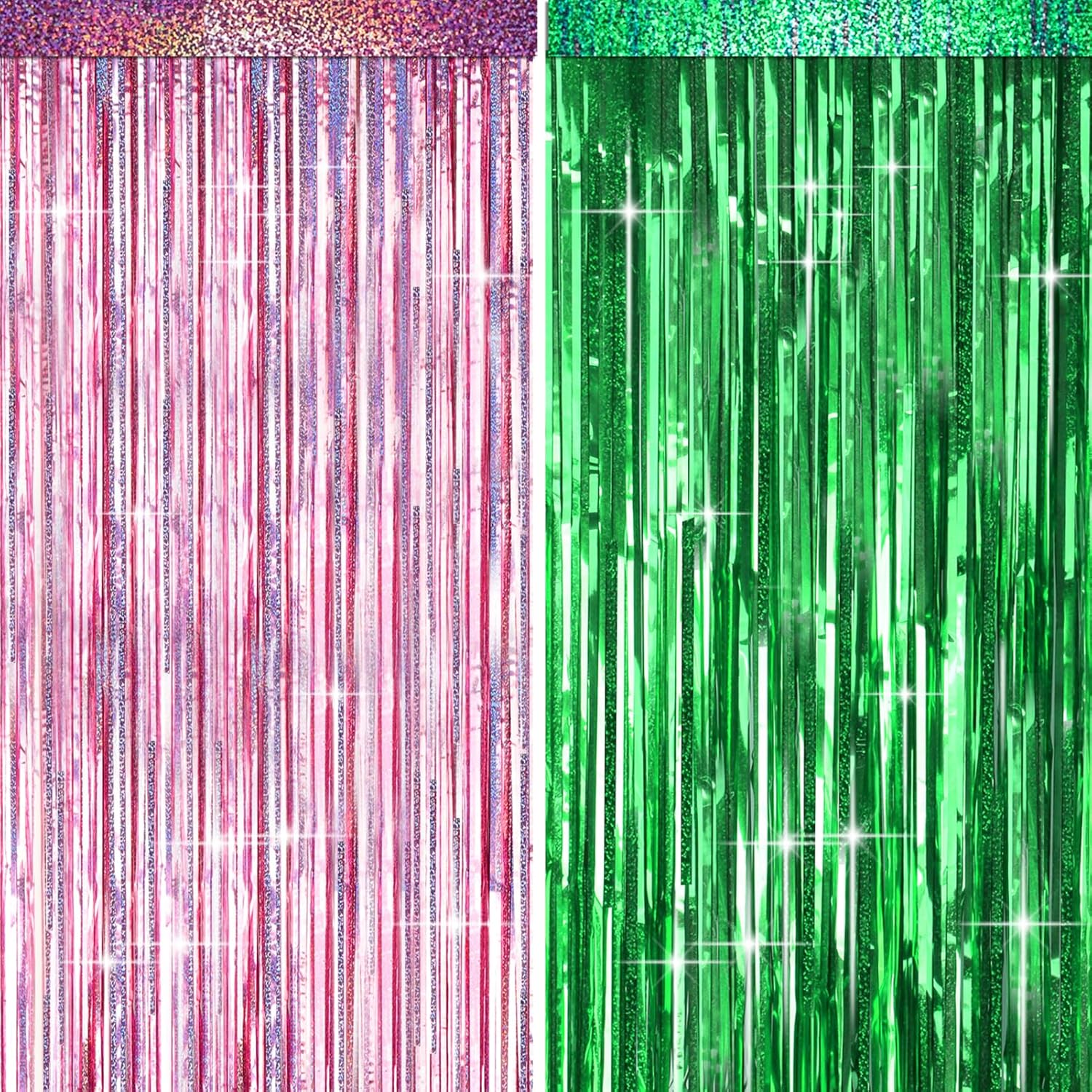 - Pink and Green Party Decorations: You will receive 4 pieces green and pink tinsel backdrop, each pack curtains size is 3.3ft x 6.6ft, enough length for decorate your party. These foil backdrop curtains are perfect for the door or wall to create an impressive decoration for parties, events, and photo booths.