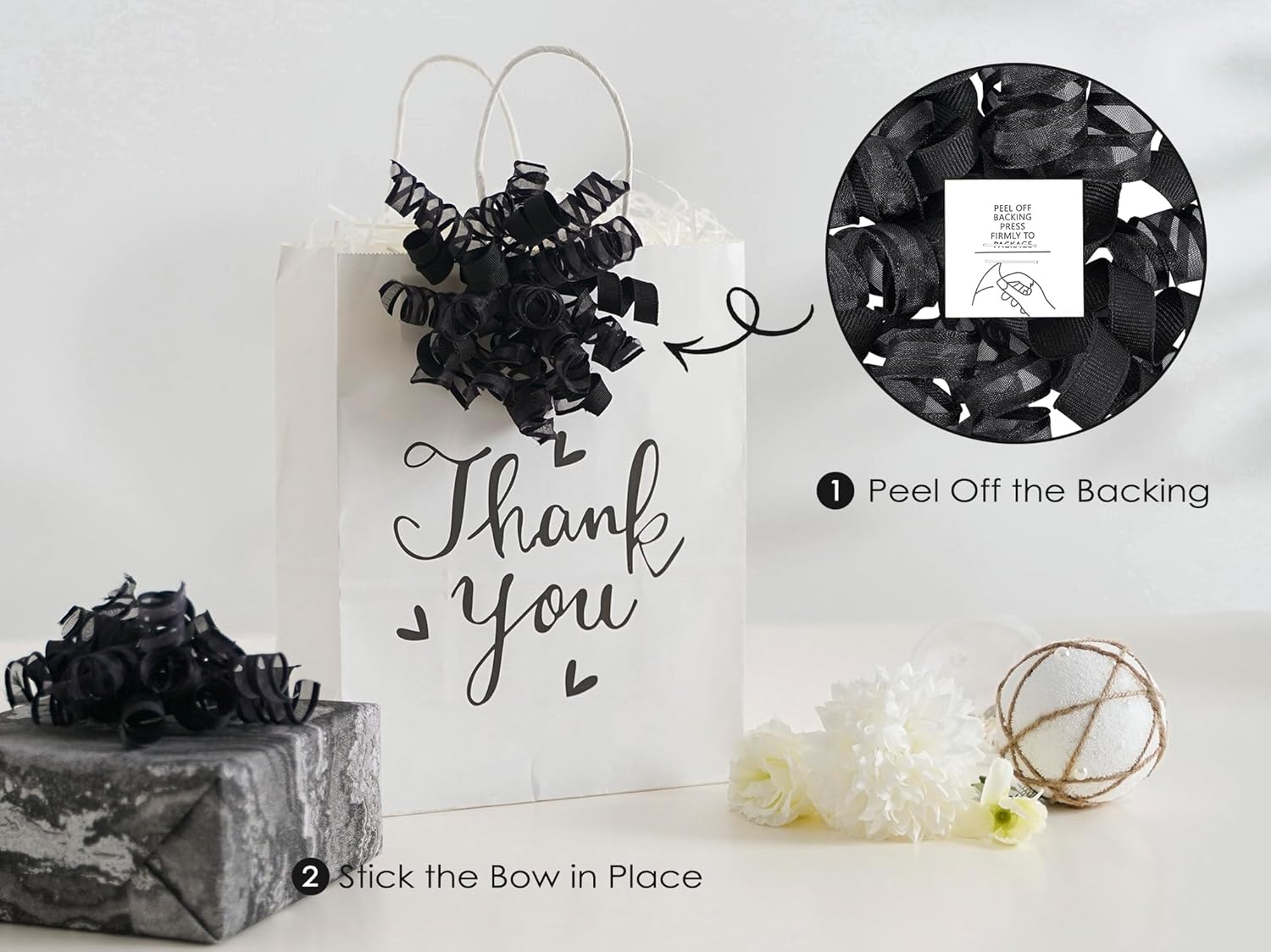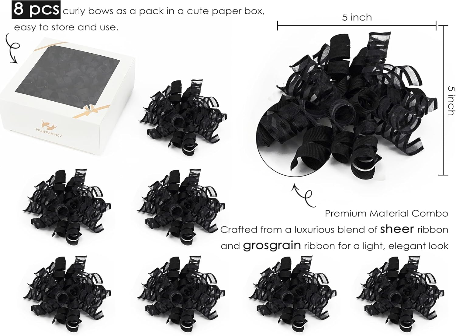 - SIZE & PACK: Each package contains 8 pcs black curly bows, and made from 12 strands of 3/8" wide grosgrain and sheer satin ribbon that adds a airy, elegance and luxurious feel to any gift or decoration. Bows measures 5"~5.5" wide
