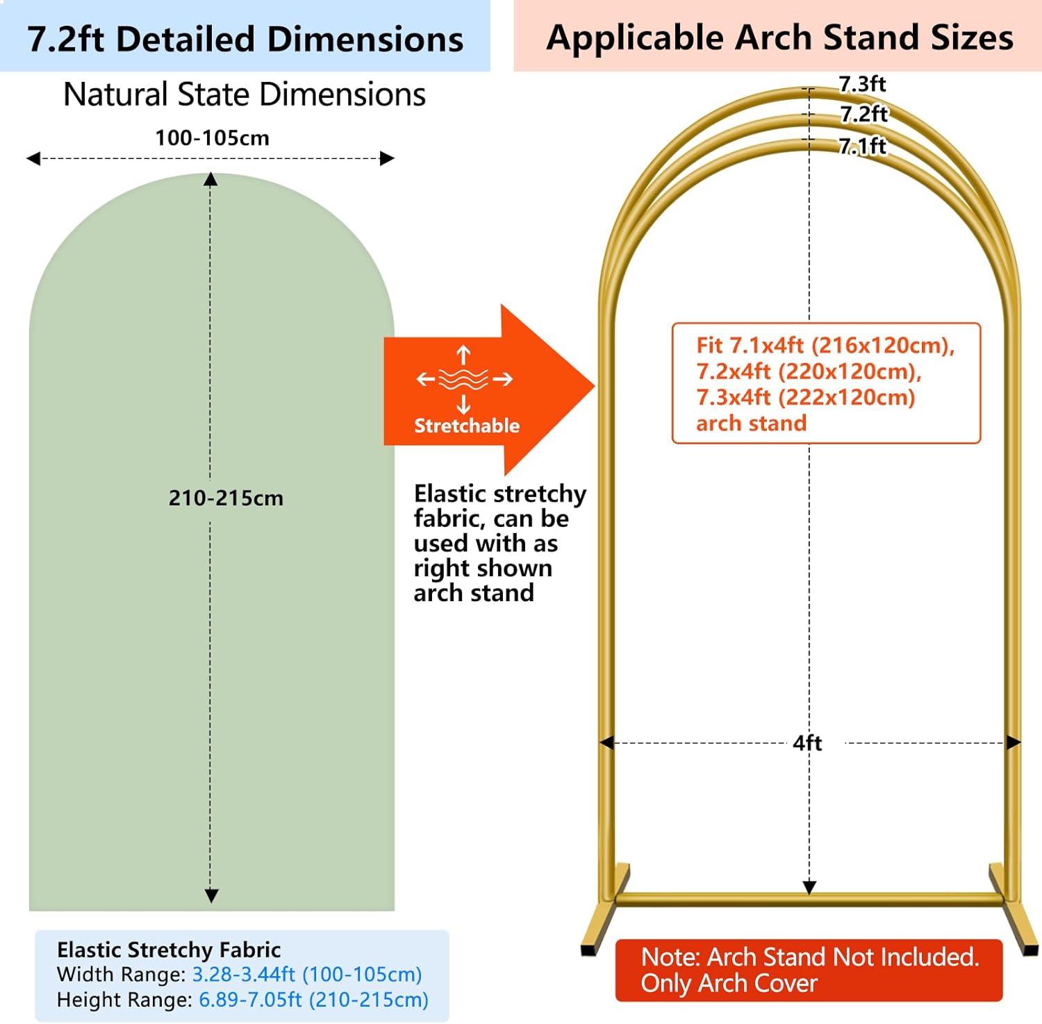 - Applicable Arch Stand Size: The arch cover has good elasticity, and the natural size range is 6.89-7.05 ft high and 3.28-3.44 ft wide. It can be used for arches with a height of 7.1 ft to 7.3 ft and a width of 4 ft. ⚠️Note: Arch stand is not included