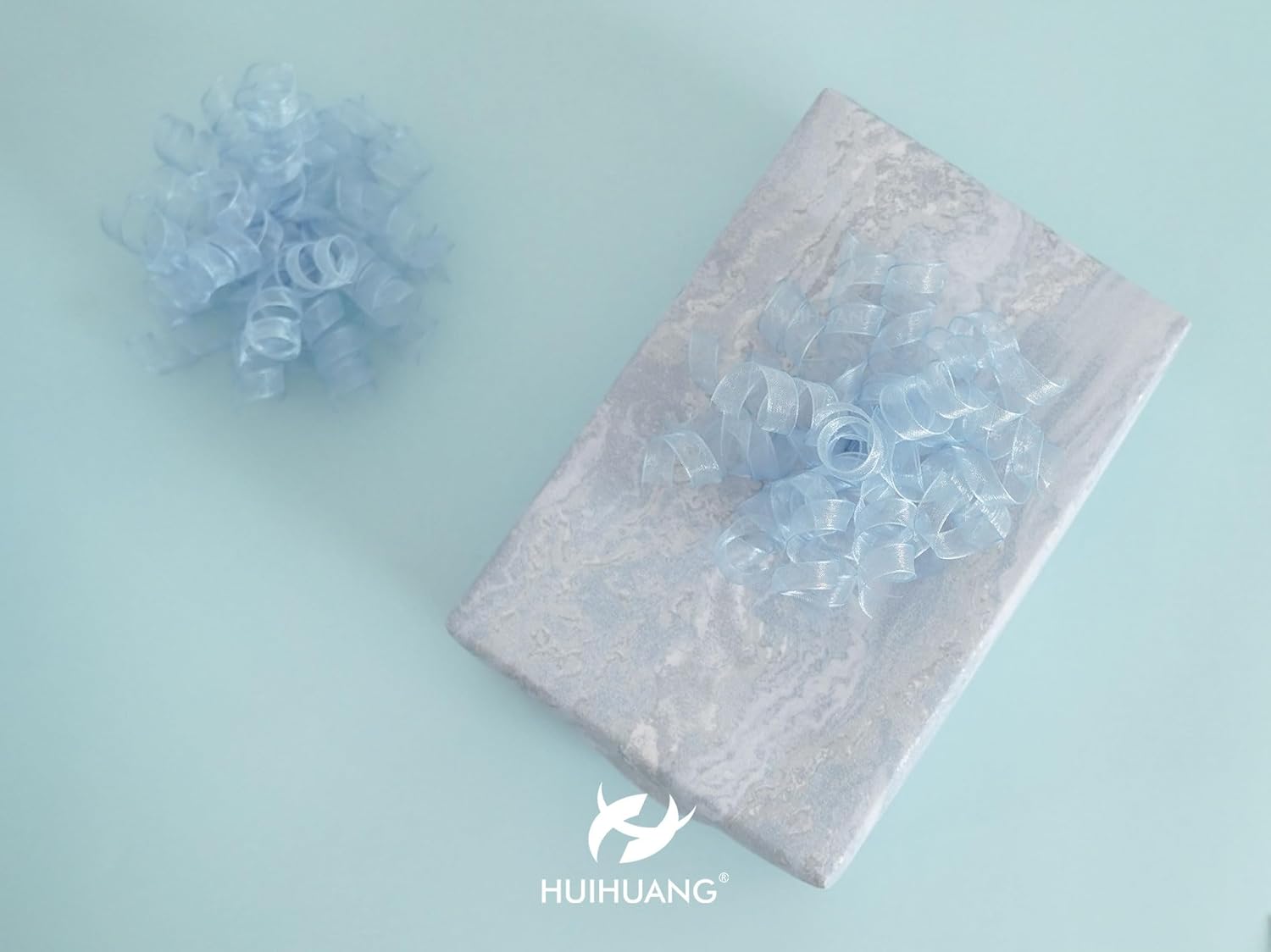 - SIZE & PACK: Each package contains 8 pcs dusty blue curly bows, and made from 12 strands of 3/8"(9mm) wide sheer ribbon that adds a light, airy, and luxurious feel to any gift or decoration. Bows measures 5"~5.5" wide, create a dramatic and burst effect, making it ideal for large gift boxes, baskets, and decorations