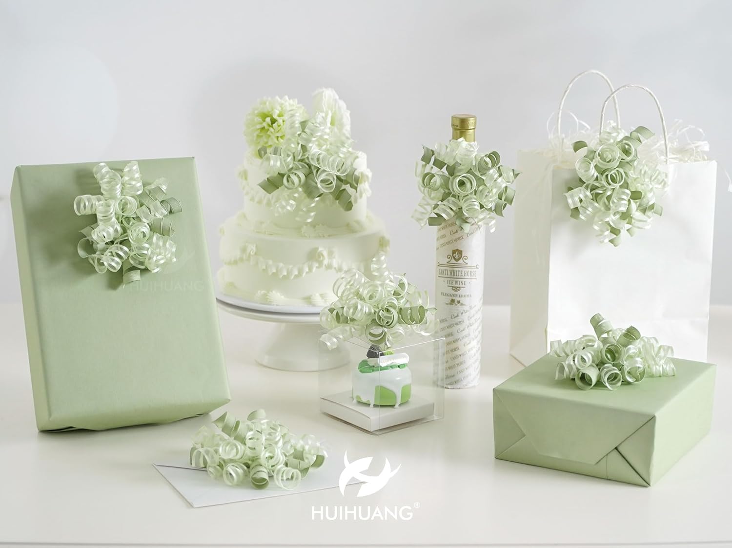 - SIZE & PACK: Each package contains 8 pcs sage green curly bows, and made from 12 strands of 3/8" wide grosgrain and sheer satin ribbon that adds a airy, elegance and luxurious feel to any gift or decoration. Bows measures 5"~5.5" wide