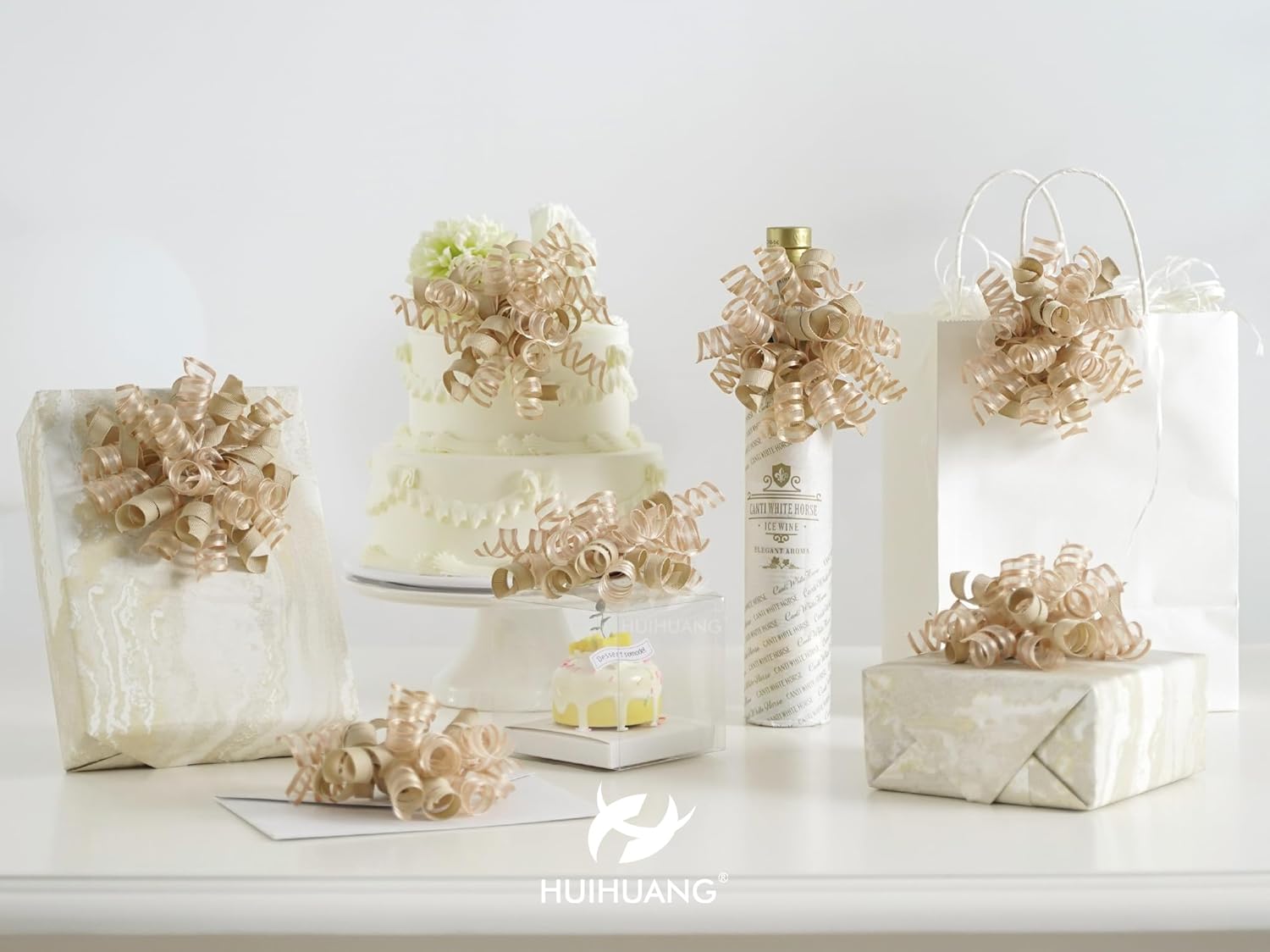 - SIZE & PACK: Each package contains 8 pcs champagne curly bows, and made from 12 strands of 3/8" wide grosgrain and sheer satin ribbon that adds a airy, elegance and luxurious feel to any gift or decoration. Bows measures 5"~5.5" wide