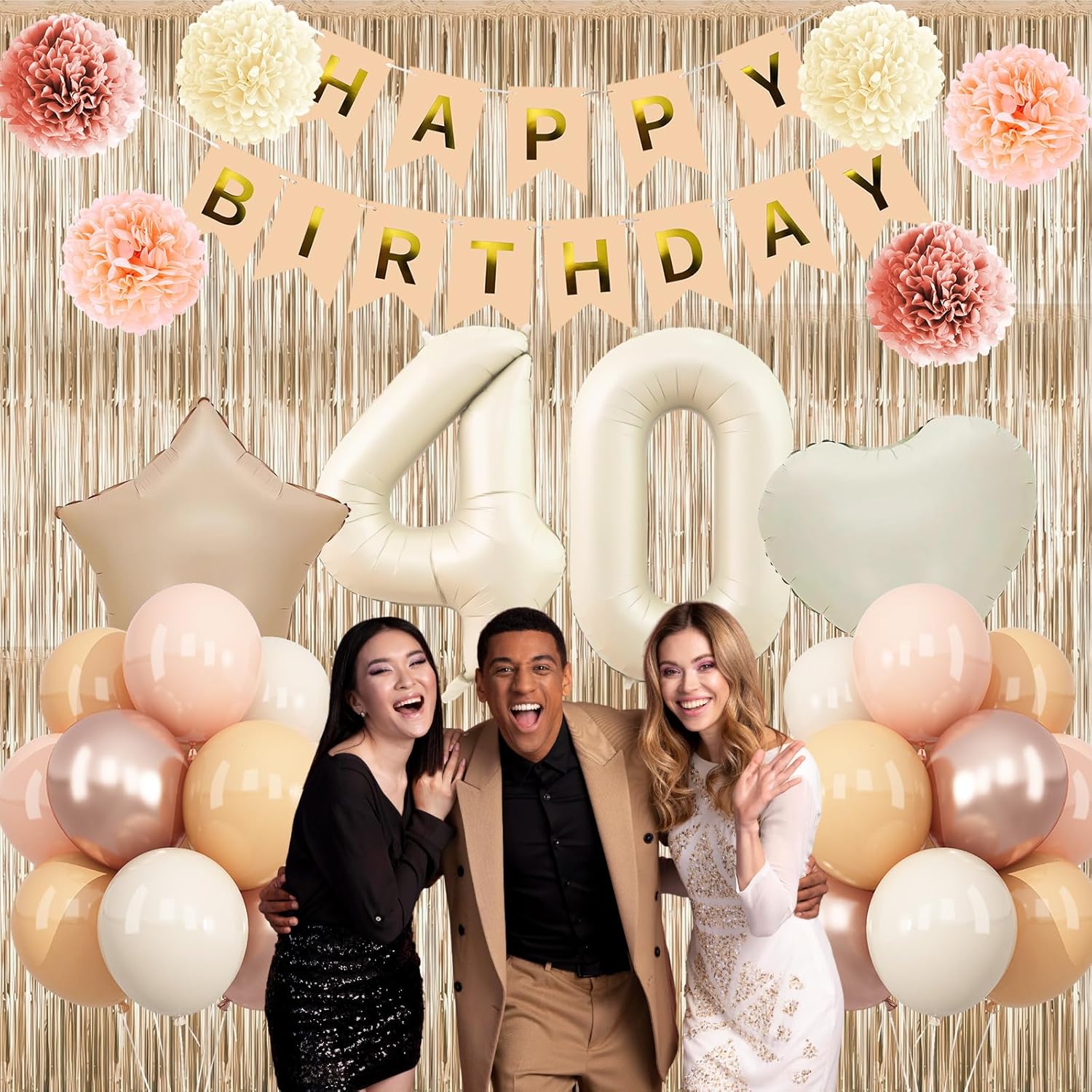- PACKAGE INCLUDES: 1pc beige 40 number balloon, 1pc happy birthday banner, 2pcs dusty pink paper pom poms, 2pcs blush paper pom poms, 2pcs nude paper pom poms, 1pc champagne gold fringe curtain, 1pc caramel star foil balloons, 1pc cream heart foil balloons, 8pcs nude balloons, 6pcs blush balloons, 8pcs beige balloons, 4pcs champagne gold balloons, 1pc ribbon