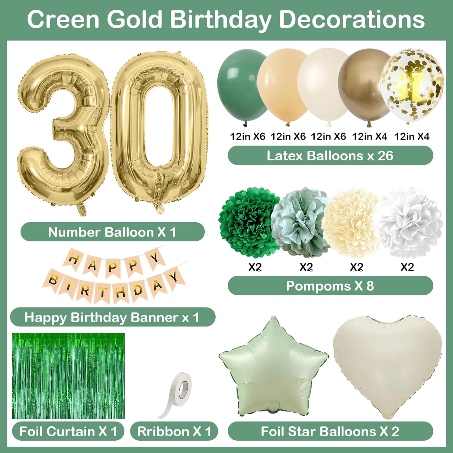 - PACKAGE INCLUDES: 1pc gold 30 number balloon, 1pc happy birthday banner, 2pcs deep green paper pom poms, 2pcs sage green paper pom poms, 2pcs nude paper pom poms, 2pcs white paper pom poms, 1pc green fringe curtain, 1pc olive green star foil balloons, 1pc cream heart foil balloons, 6pcs nude balloons, 6pcs sage green balloons, 6pcs beige balloons, 4pcs metallic gold balloons, 4pcs gold confetti balloons, 1pc ribbon