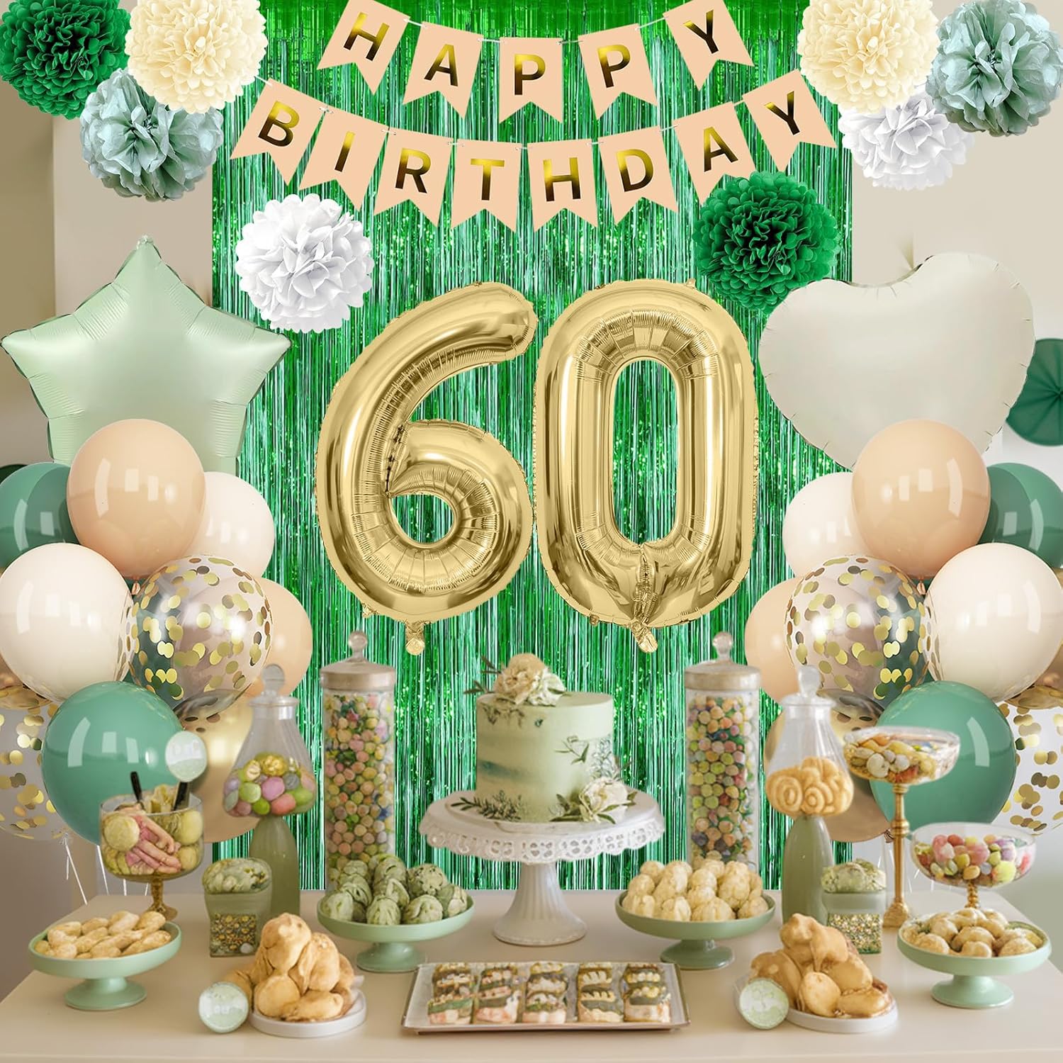 - PACKAGE INCLUDES: 1pc gold 60 number balloon, 1pc happy birthday banner, 2pcs deep green paper pom poms, 2pcs sage green paper pom poms, 2pcs nude paper pom poms, 2pcs white paper pom poms, 1pc green fringe curtain, 1pc olive green star foil balloons, 1pc cream heart foil balloons, 6pcs nude balloons, 6pcs sage green balloons, 6pcs beige balloons, 4pcs metallic gold balloons, 4pcs gold confetti balloons, 1pc ribbon