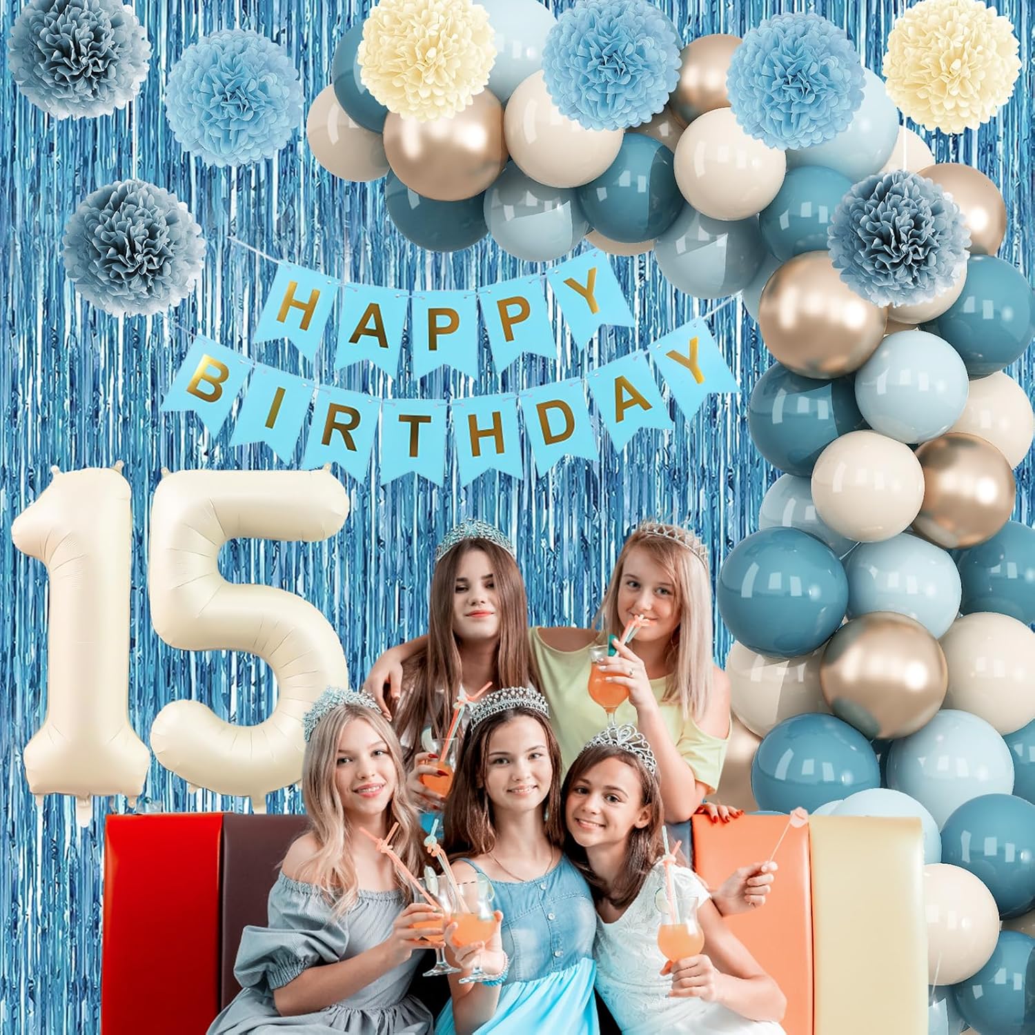 - PACKAGE INCLUDES: 1pc 15 number balloon, 1pc happy birthday banner, 3pcs light blue paper Pom Poms, 3pcs dusty blue paper pom poms, 3pcs nude paper pom poms, 1pc blue fringe curtain, 2pcs dusty blue star foil balloons, 8pcs dusty blue balloons, 7pcs fog blue balloons, 7pcs beige balloons, 4pcs champagne gold balloons, 1pc ribbon