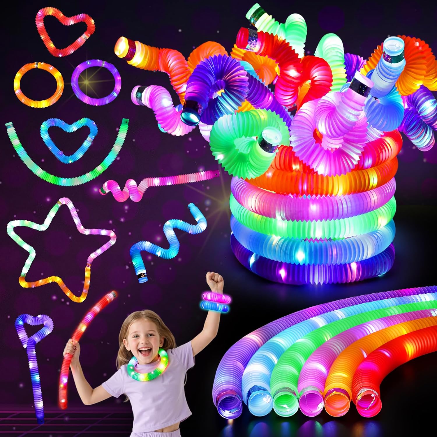 - Large Number of Glow Sticks - Retractable Design: Perfect for kids' events, festivals, and parties, this set includes 24 glow sticks in 6 vibrant colors. Each pop tube features 14 bright LED bulbs with 3 lighting modes: fast flash, slow flash, and steady light, creating a captivating glow. When stretched, each tube extends to 25 inches, while its size is 7.5 x 1.2 inches before stretching