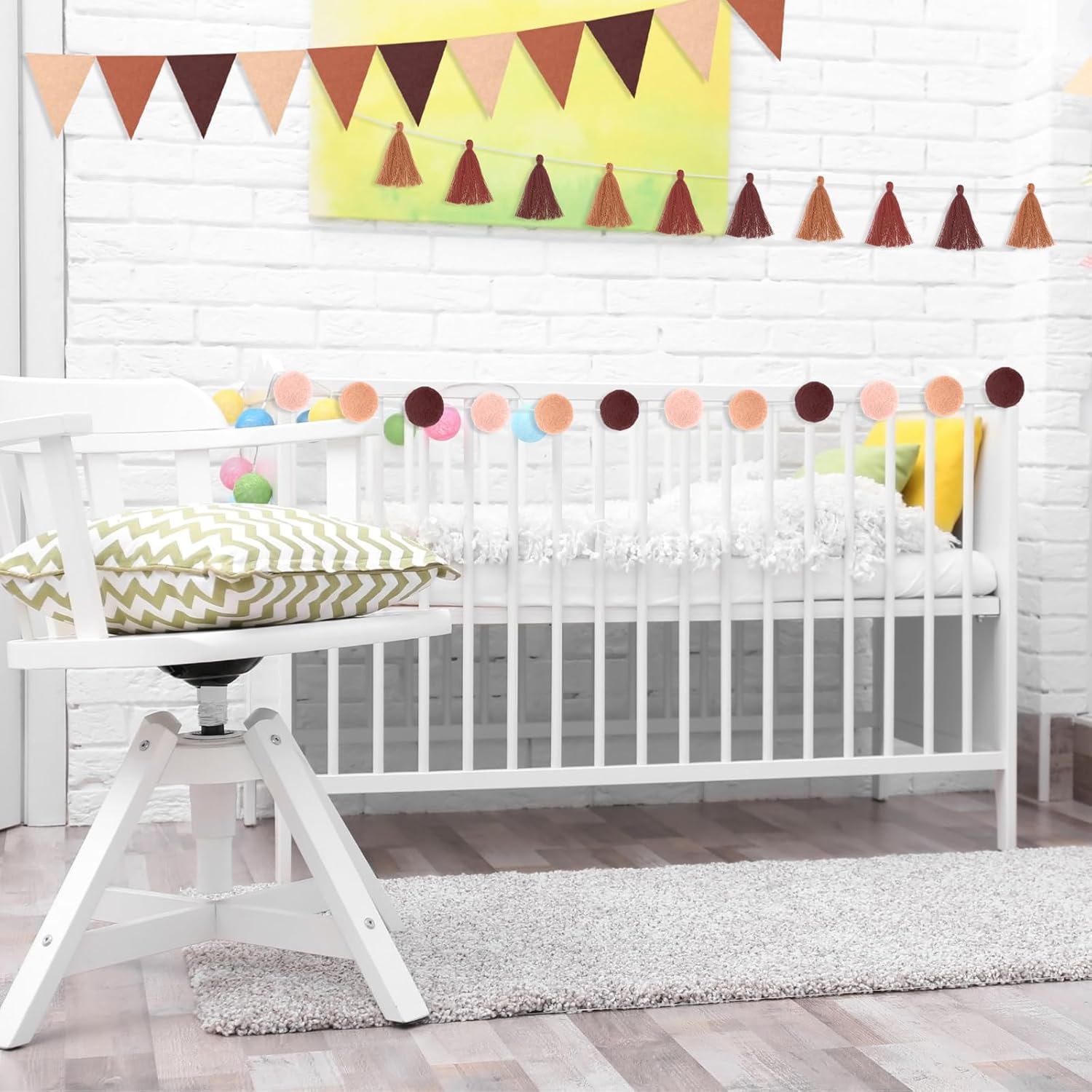 - Nice decoration set: the pom pom garland looks elegant and cute when hung on the wall or as backdrop decorations, easy to hang on the ceilings, walls as party or home decoration; Each garland consists of 10 pieces of tassels and each tassel contains multiple colors, full of warm and sweet feelings; The pennant banner cutting is neat, will not easily fall off or break, durable and reusable