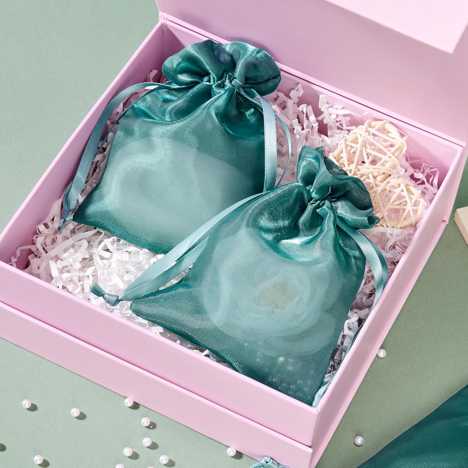 - PREMIUM MATERIAL: Crafted with high-density organza and satin drawstrings, these favor bags have a glamorous gloss that changes with the light, which is different from ordinary organza bags, makes it beautiful and elegant, which is good for special occasions. The delicate sheer fabric combines ethereal translucency with surprising durability, transform small items like jewelry and cosmetics into luxurious displays