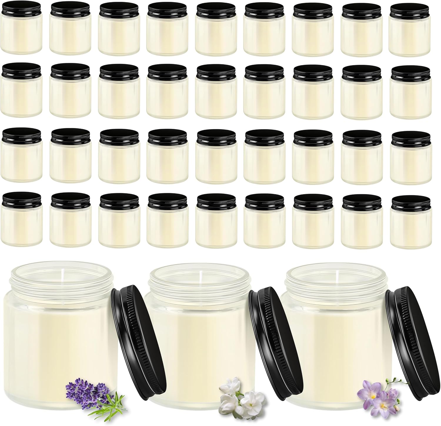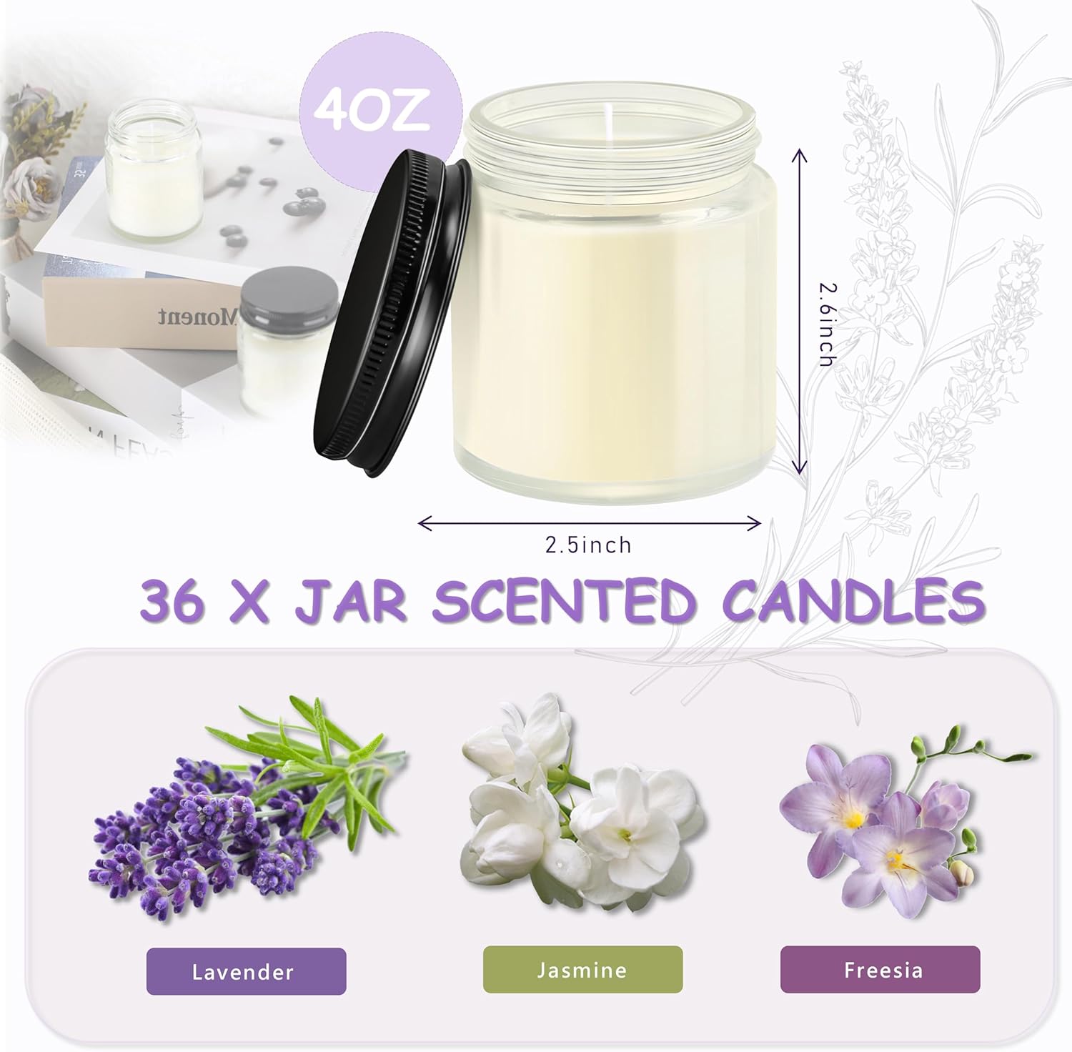 - Product Contents: 36 candles (4 oz each) in glass jars with black lids, including 12 lavender, 12 freesia, and 12 jasmine-scented candles.